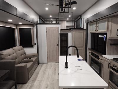 Two full bathrooms and two private bedrooms make this fifth wheel perfect for camping with friends and family. The front bedroom includes a king bed with a queen bed option, a large front wardrobe, plus stackable washer and dryer prep. The rear master bedroom has two closets plus a dresser and underbed storage, plus its own full bath with an exterior entry door for convenience. There is even a loft above the rear bedroom for even more sleeping space! Everyone can meet in the main living area/kitchen to relax on the power theater seat as the chef cooks dinner, and you can watch a show on the Smart HDTV to pass the time. The kitchen island will provide more counter space, along with the hutch that includes overhead cabinets as well. Don't let this luxury fifth wheel slip away!