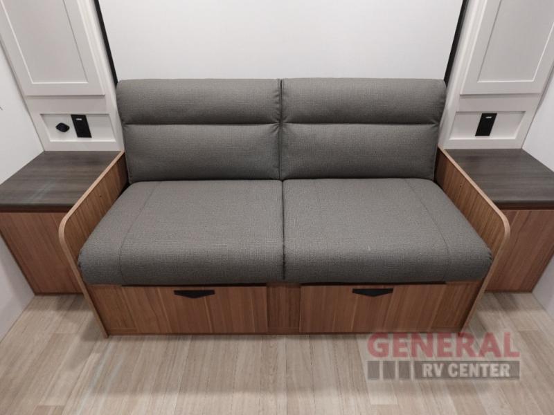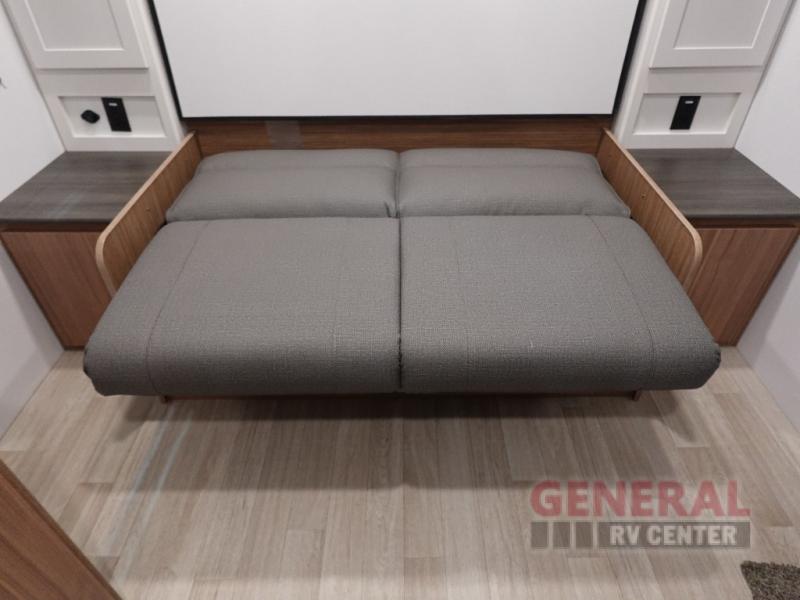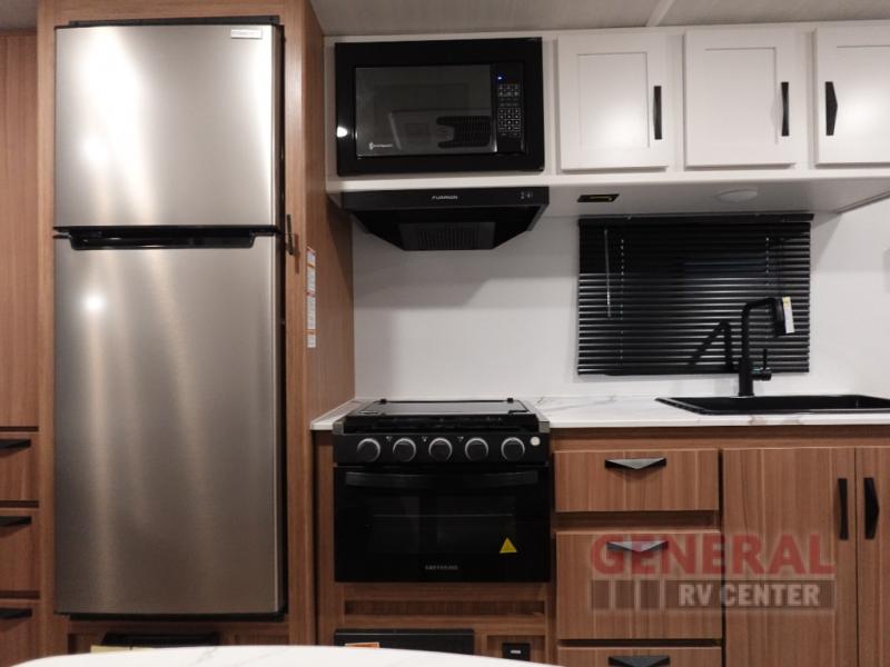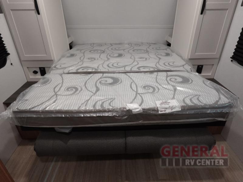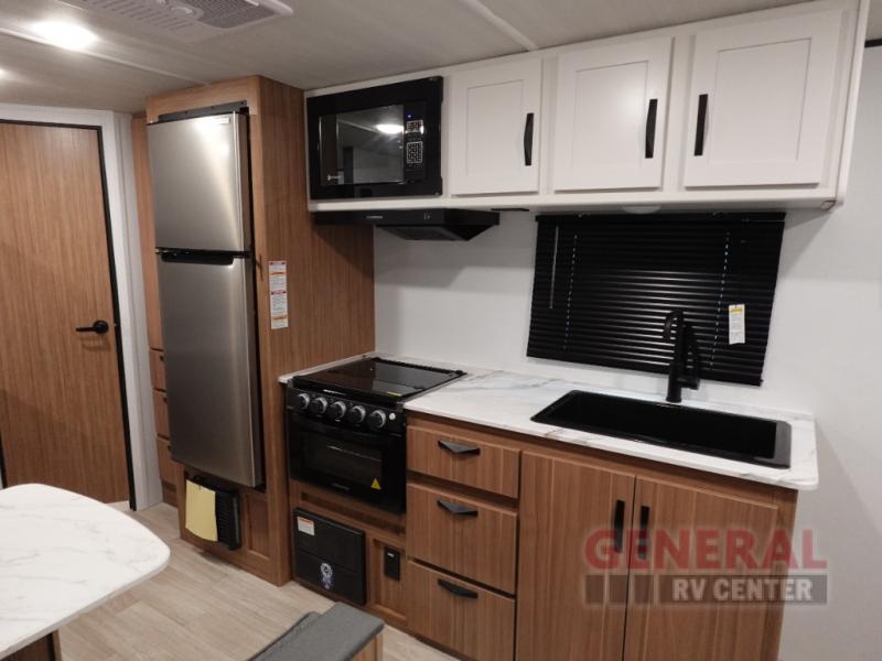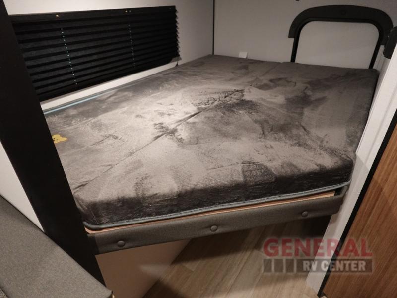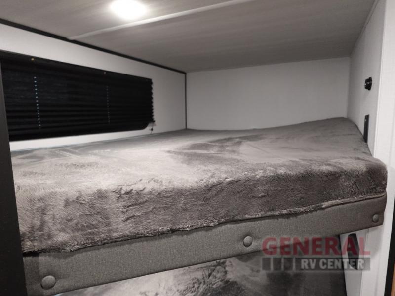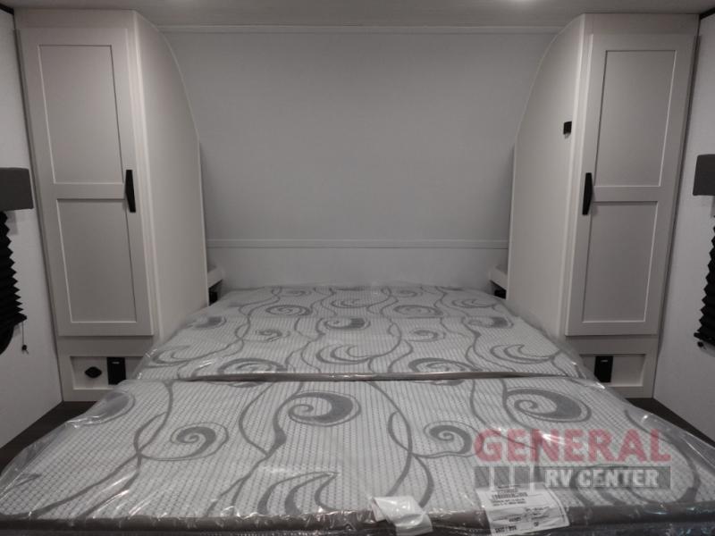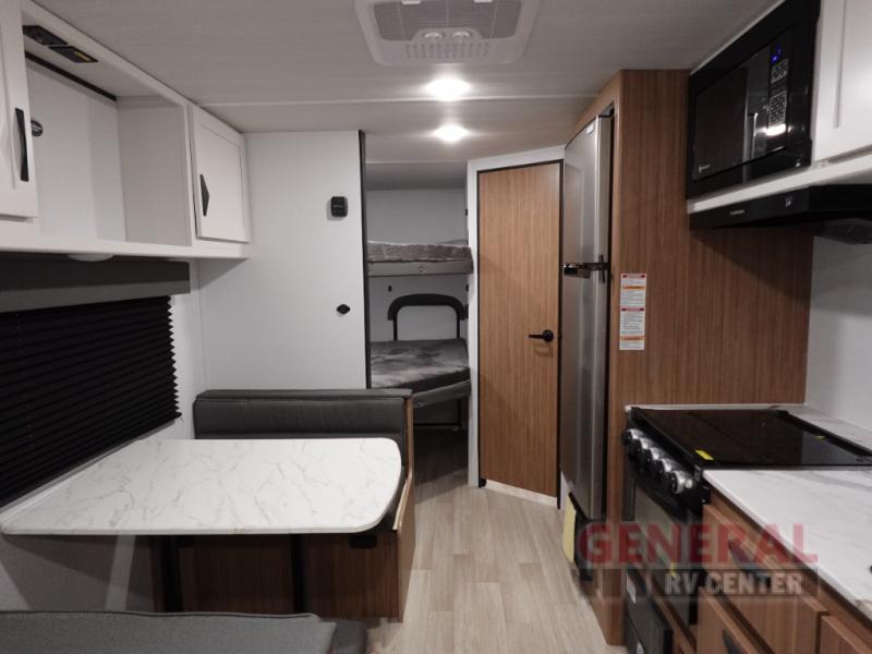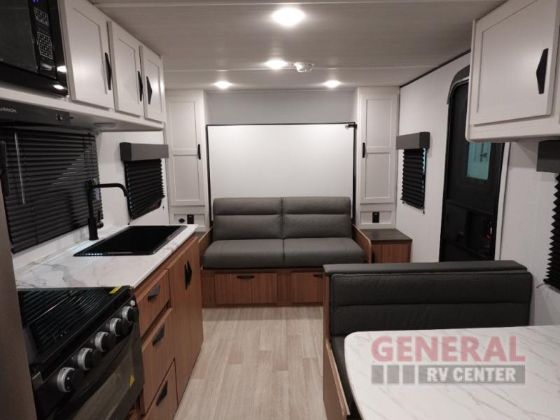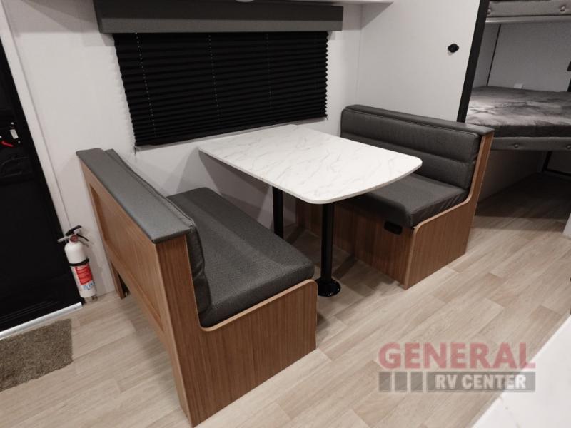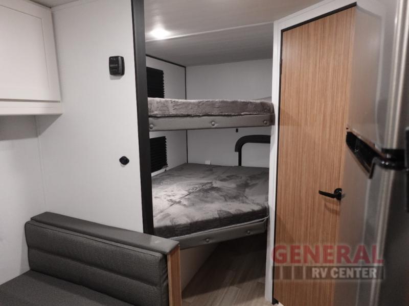 Your kids will love this travel trailer! The double-size bunks provide comfortable sleeping quarters, while the booth dinette offers a cozy spot for meals and relaxation. The full bathroom features everything you need to take care of yourself and is convenient on the go, plus, a refrigerator, microwave, and two-burner cooktop make meal prep a breeze. The overhead cabinets and pantry provide ample storage for your favorite spices and belongings. Moreover, the Murphy bed offers additional sleeping space, and the wardrobe and nightstand on each side of the bed provide convenient storage and comfort. On the outside, you will find A 17' awning that provides shade and protection, while pass-thru storage offers additional space for gear and equipment.