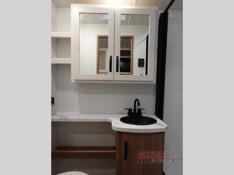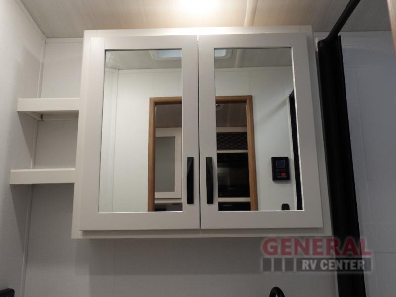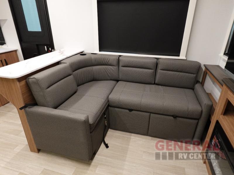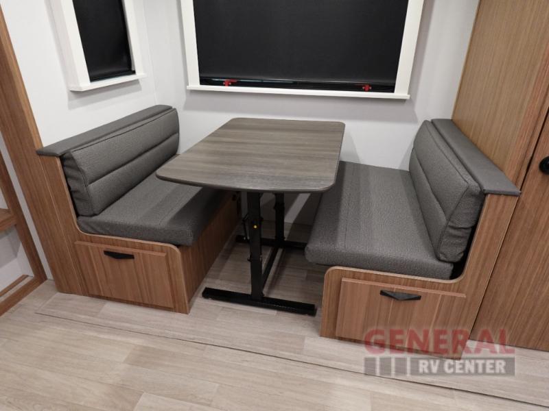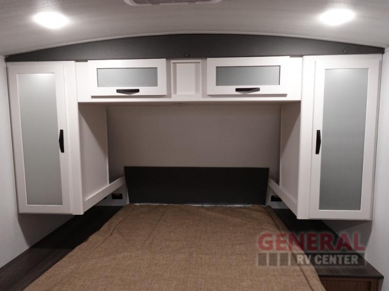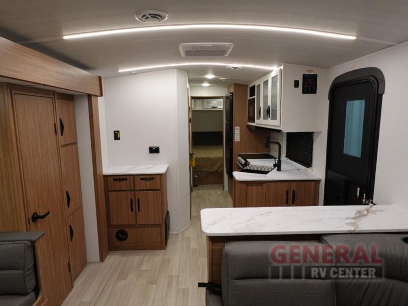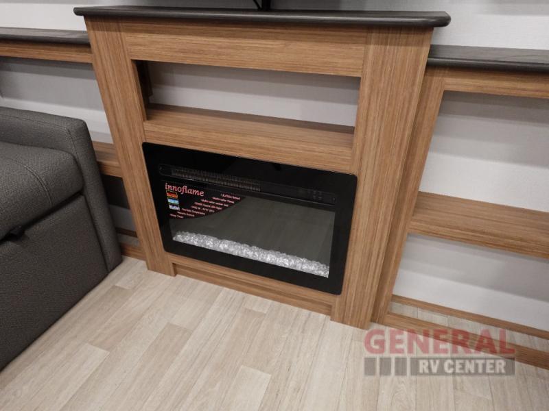 Step right into this rear living travel trailer for fun trips at the lake! There is an L-shaped sectional sofa in the back, along with an entertainment center and a fireplace to enjoy cozy evenings indoors. The do-more dinette table will provide a place to dine, play games, and even let a guest or two littles ones sleep. This unit also includes a spacious pantry and a coffee station where you can set up your own Keurig machine. A full kitchen will let you prepare meals each day, and the mid-coach full bath will be easily accessible for everyone to use. You will also love the front private bedroom with its queen bed, plus dual wardrobes and dual nightstands so everything has its own place!