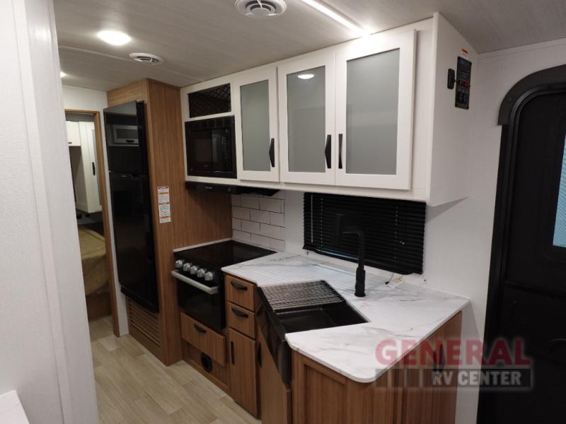 With any Keystone Passport Super Lite travel trailer you will enjoy lightweight towing and lots of interior comforts! The power tongue jack lets you hitch up at the drop of a hat, and the Dexter torsion axle rubber ride suspension will make towing easier than ever. You will appreciate having power stabilizer jacks for quick setup and an exterior convenience center to monitor tank levels. These trailers are constructed with a seamless, laminated and gel-coated filon exterior, 80% tinted safety glass windows, and a one-piece polypropylene underbelly. The interior will have you feeling right at home with residential durable Beauflor vinyl flooring, deluxe night shades, and seamless kitchen countertops to name a few comforts.