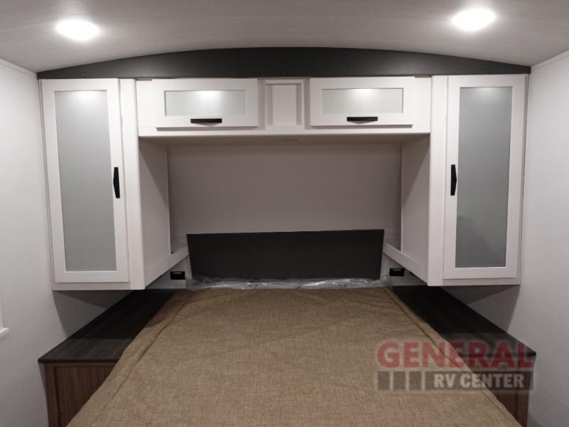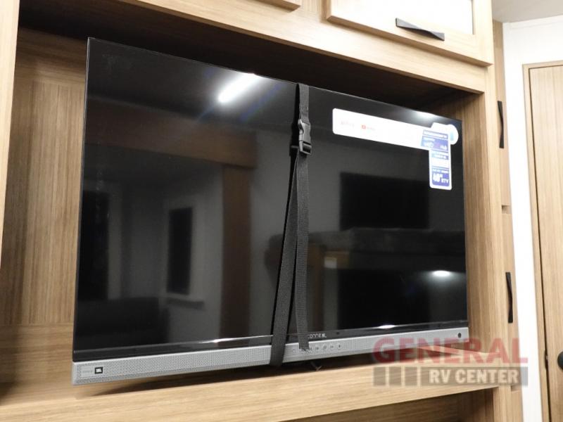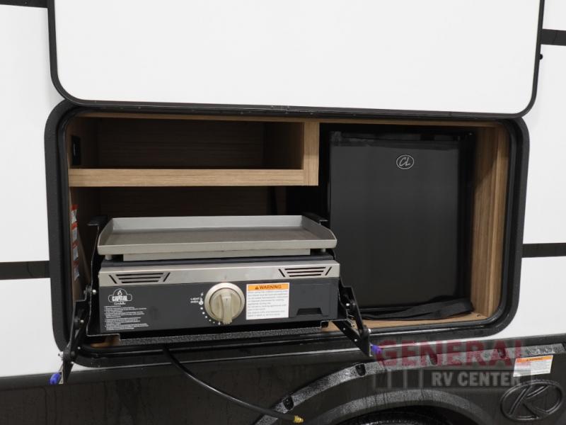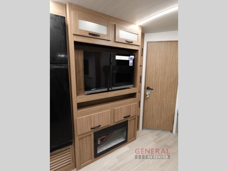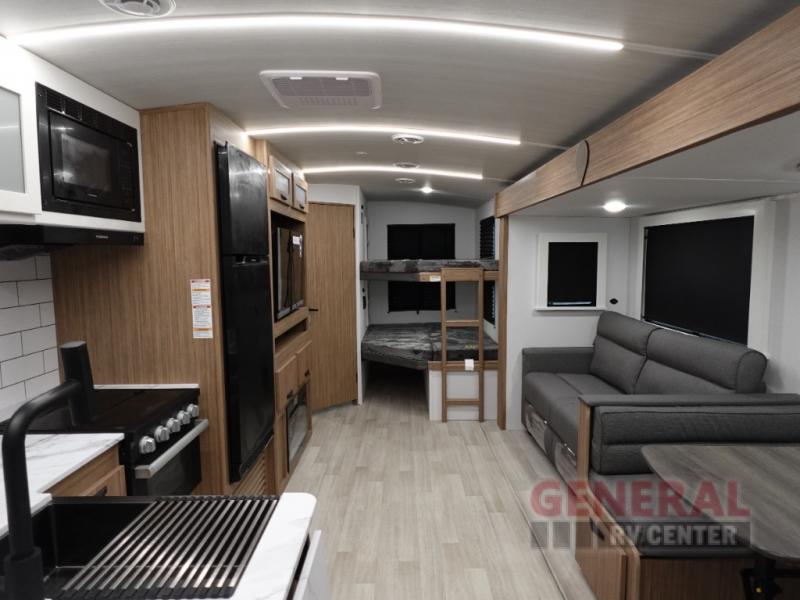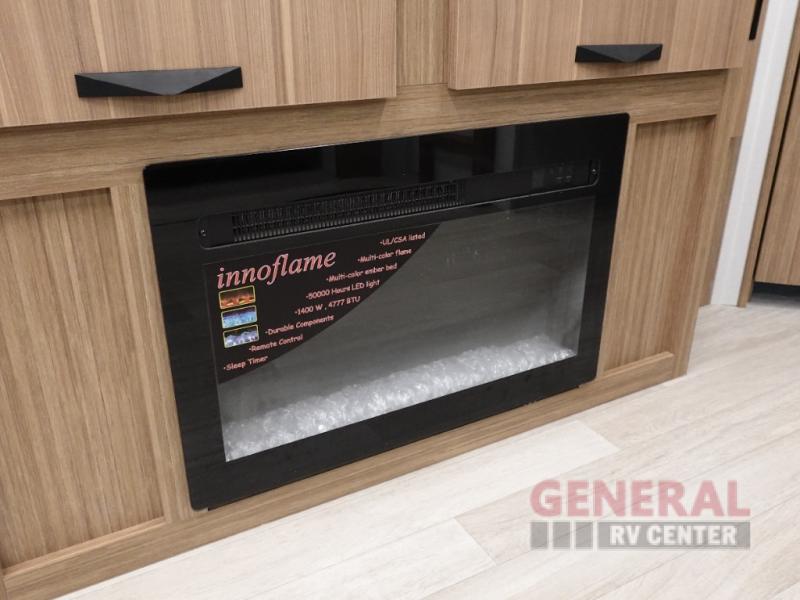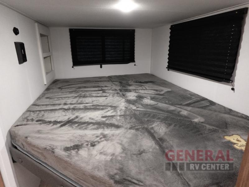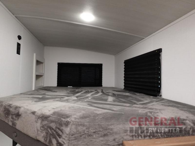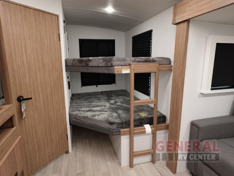 Camping at your favorite campground in this bunkhouse model will be just what the doctor ordered! One of the bunks is a flip-up bunk for added storage, and the full bath with its own exterior entry door is close by for easy nighttime use. The combined living area and kitchen is made spacious by the large slide out, and here you can relax on the tri-fold sofa and do-more dinette table. There is also an entertainment center with a fireplace to make this space feel a little more like home. The chef of your group can choose to cook indoors or outdoors on the exterior kitchen, and there is a 21' awning for shade. This unit also includes a front private bedroom with a queen bed and dual wardrobes to keep your things tidy.