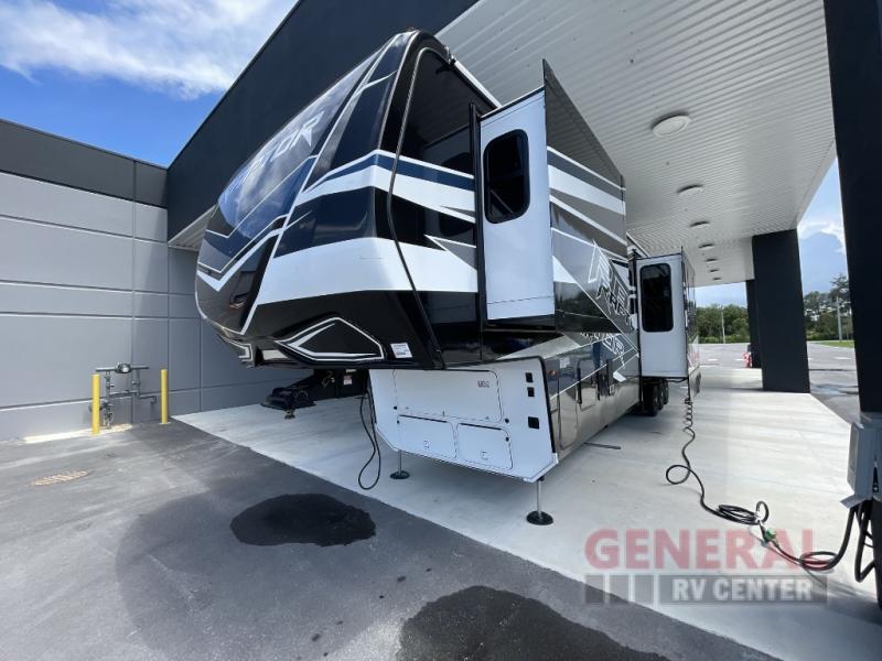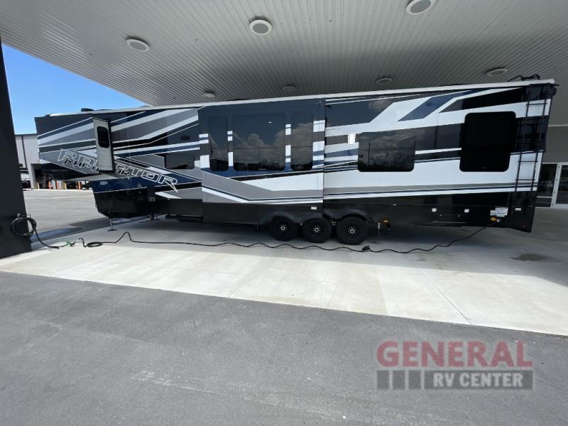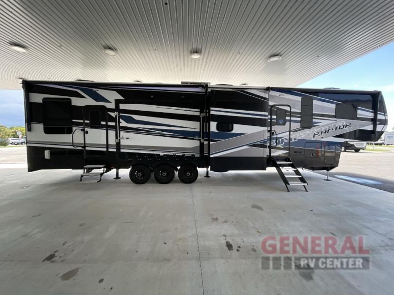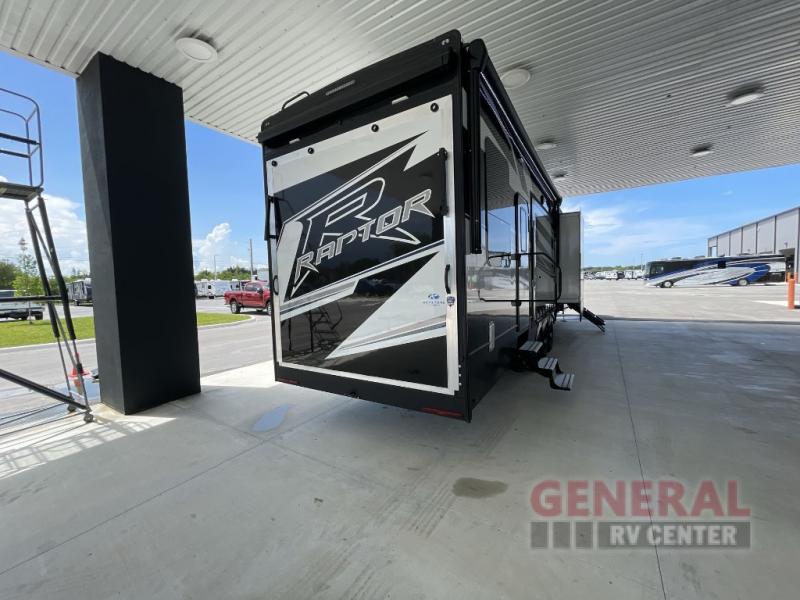 Experience a breath of fresh air with one of these Keystone RV Raptor fifth wheel toy haulers! Their rugged construction consists of a one-piece Alpha Super Flex TPO roof membrane, Dyna Span floor decking, and 5,000 lb. frame-welded tie- downs to keep your toys in place as you travel. Some unexpected conveniences you will appreciate include an Omni-Chill A/C system to keep you cool on those hot summer days, a Furrion backup camera and Hitch Vision to prevent damages, and a Generation 3 iN-Command smart automation system with Global Connect to make life easier. There is also designer style vinyl flooring throughout, along with hardwood ceiling treatment with LED accent lighting, beach wood and white cabinetry, and many more interior comforts!