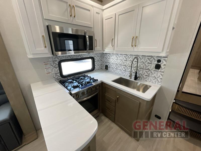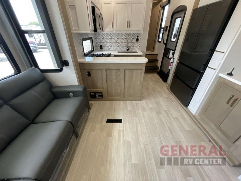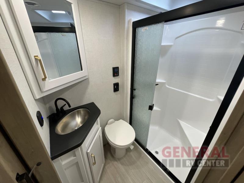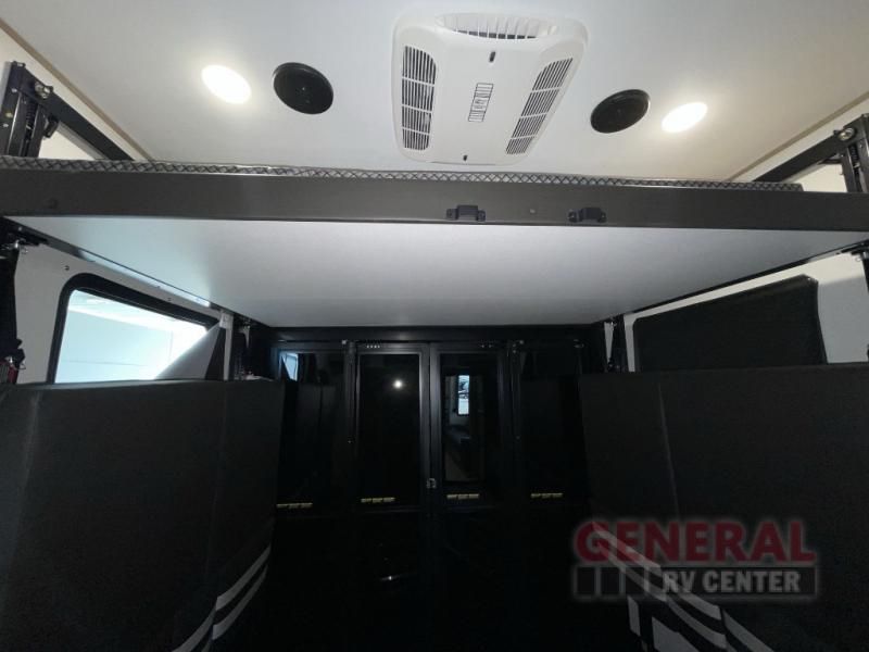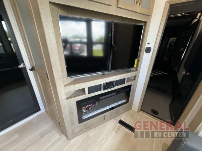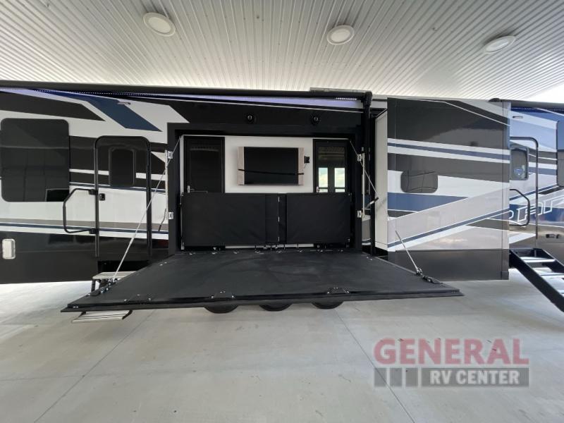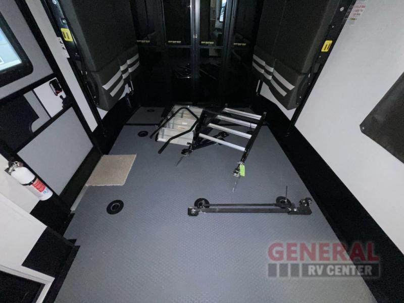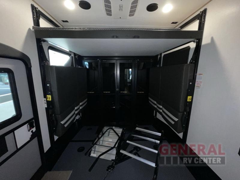 You will be the talk of the campground with a 9' 10" side patio and outside TV on this toy hauler! As you enter the 13' garage area, you will notice an electric bed above dual opposing sofas with a table in between for meals or games, a loft with a twin bed, a half bathroom, and even washer and dryer prep. The 4-seat recliner slide is across from the entertainment center which features a 50" Smart LED TV and a fireplace for a cozy evening indoors. Prepare your best meals with the four burner cooktop in the U-shaped kitchen and freshen up each morning in the dual entry bathroom with the shower. The bathroom also leads directly into the front private bedroom which offers a king bed suite, wireless phone chargers on either side of it, and a wardrobe slide to keep your clothes looking their best!