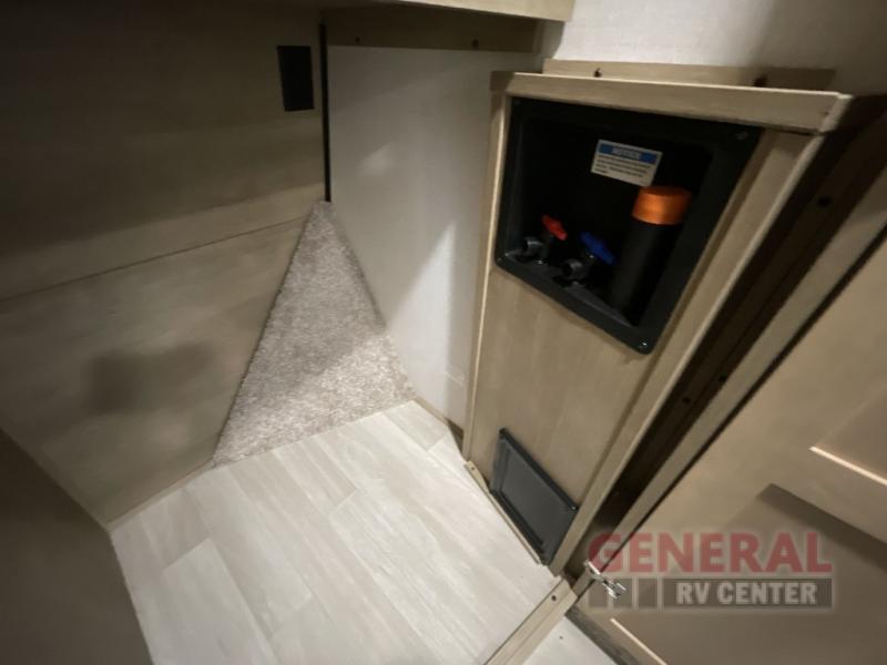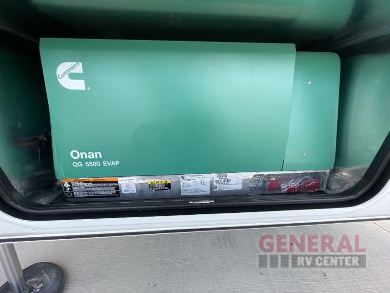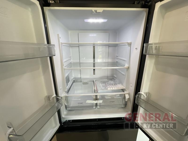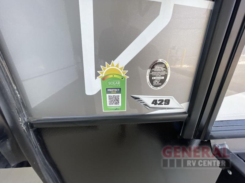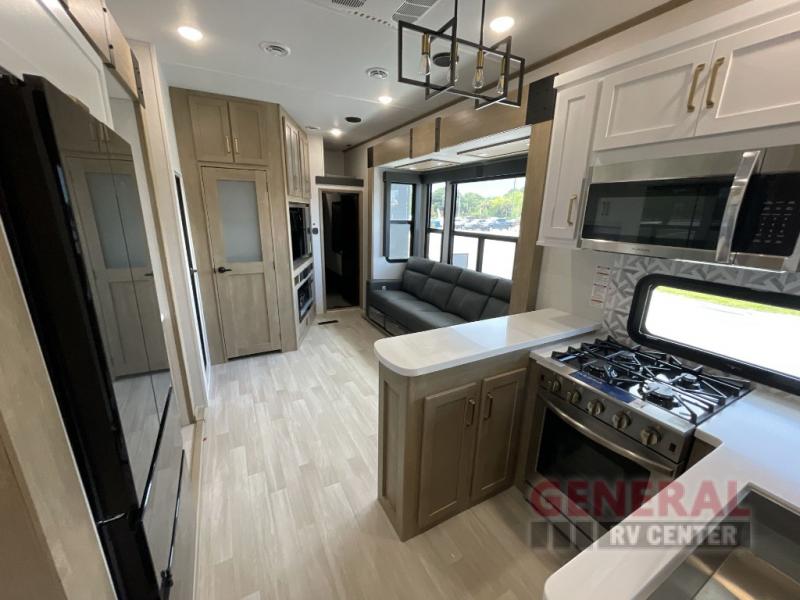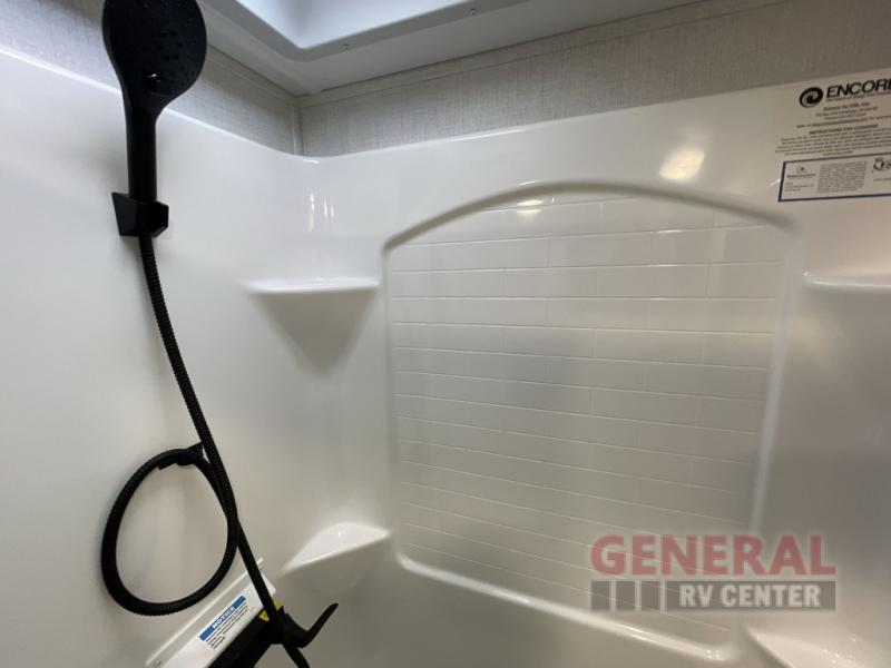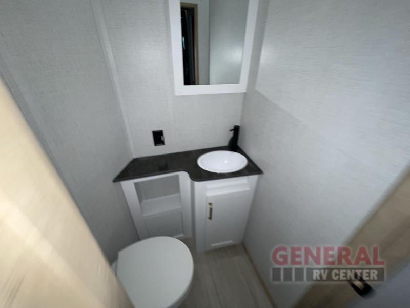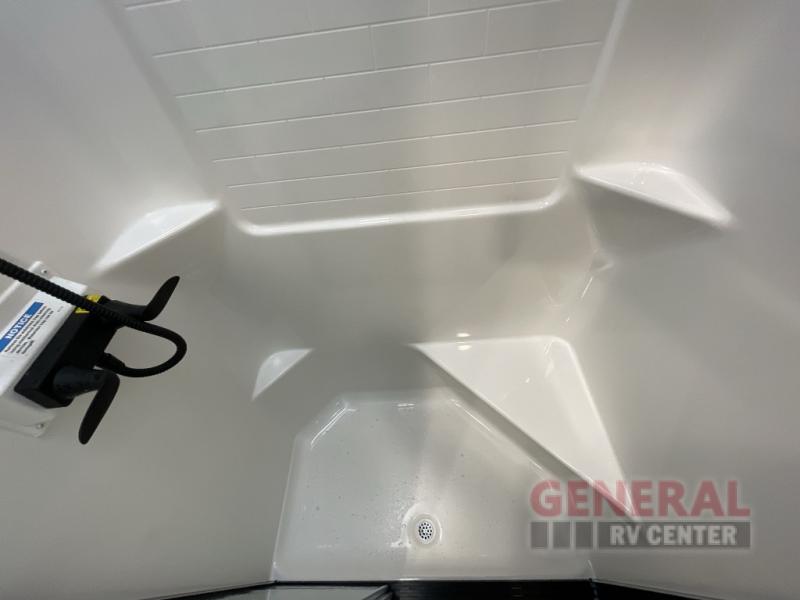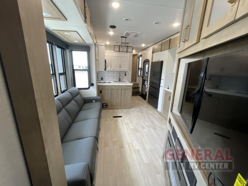 You will be the talk of the campground with a 9' 10" side patio and outside TV on this toy hauler! As you enter the 13' garage area, you will notice an electric bed above dual opposing sofas with a table in between for meals or games, a loft with a twin bed, a half bathroom, and even washer and dryer prep. The 4-seat recliner slide is across from the entertainment center which features a 50" Smart LED TV and a fireplace for a cozy evening indoors. Prepare your best meals with the four burner cooktop in the U-shaped kitchen and freshen up each morning in the dual entry bathroom with the shower. The bathroom also leads directly into the front private bedroom which offers a king bed suite, wireless phone chargers on either side of it, and a wardrobe slide to keep your clothes looking their best!