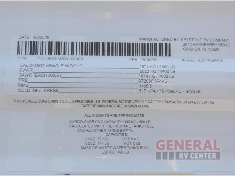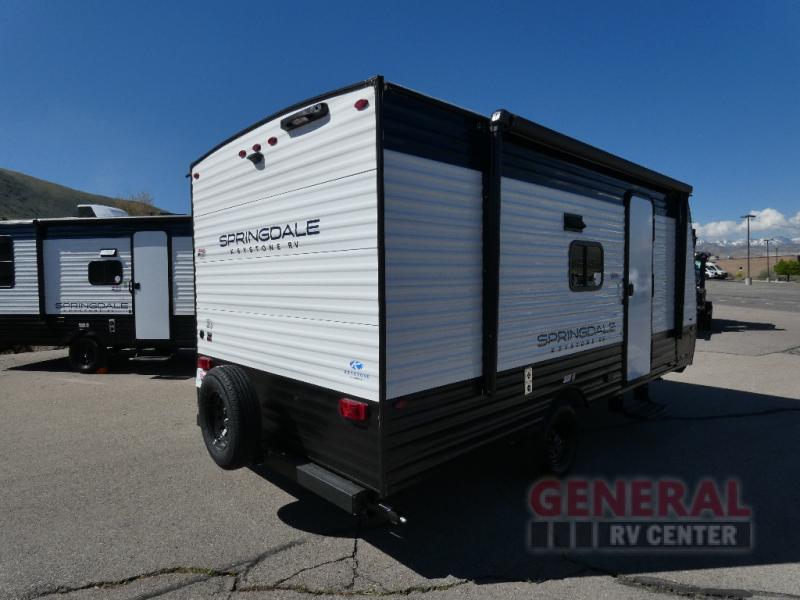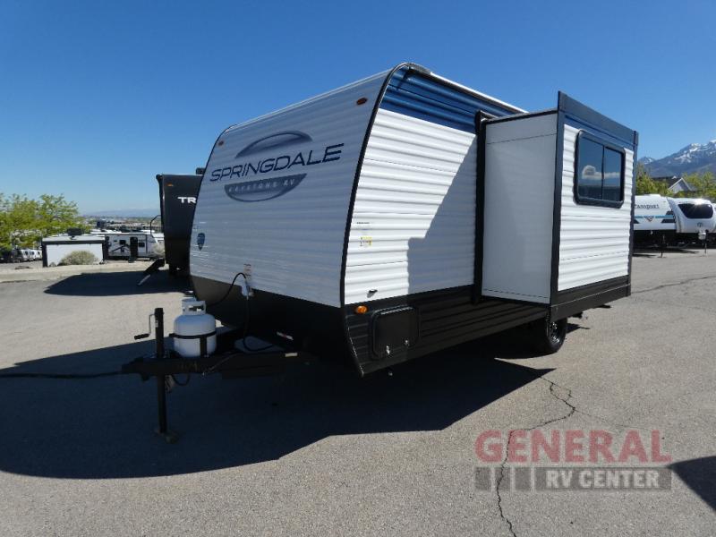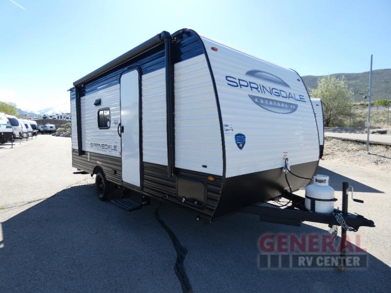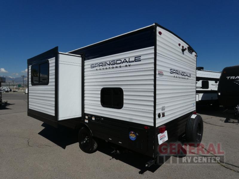 With any Springdale Classic Mini travel trailer by Keystone, you will enjoy lightweight towing thanks to their single-axle! You'll find the XL entry assist handle will make entering and exiting your unit easier than ever, and the power awning will provide protection from the sun as you relax in your camp chairs outside. Each model includes blackout night shades, solid wood cabinet doors and drawers, a shower skylight for more standing room, plus many more interior comforts. There is also a 5,000 BTU sidewall A/C and 20K BTU furnace to keep you comfortable, plus a Girard tankless water heater for endless hot showers!