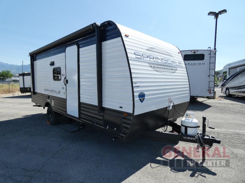 With any Springdale Classic Mini travel trailer by Keystone, you will enjoy lightweight towing thanks to their single-axle! You'll find the XL entry assist handle will make entering and exiting your unit easier than ever, and the power awning will provide protection from the sun as you relax in your camp chairs outside. Each model includes blackout night shades, solid wood cabinet doors and drawers, a shower skylight for more standing room, plus many more interior comforts. There is also a 5,000 BTU sidewall A/C and 20K BTU furnace to keep you comfortable, plus a Girard tankless water heater for endless hot showers!