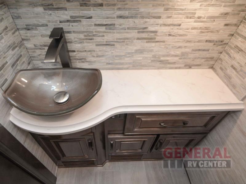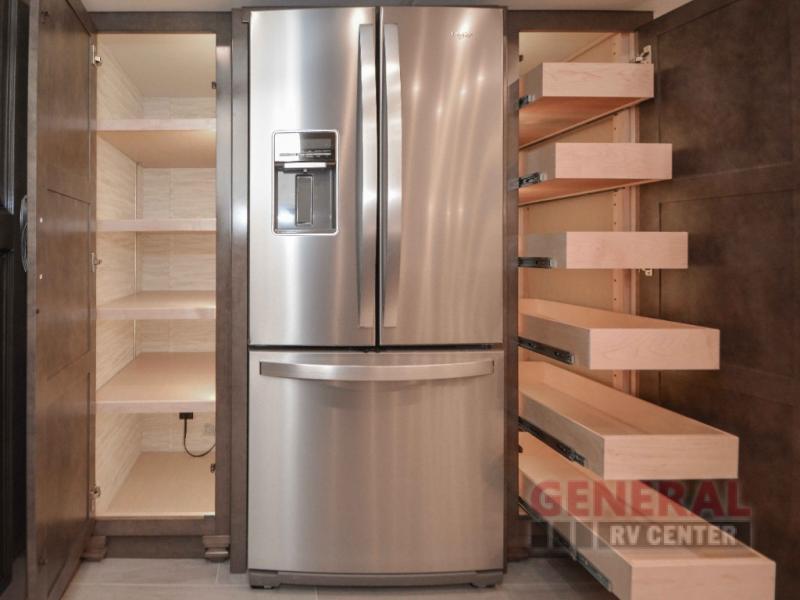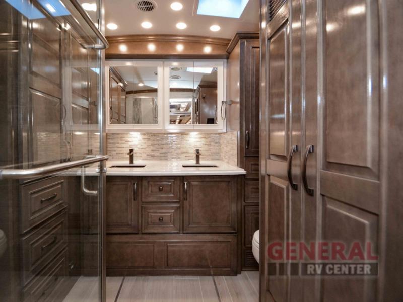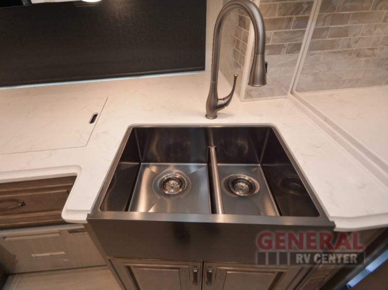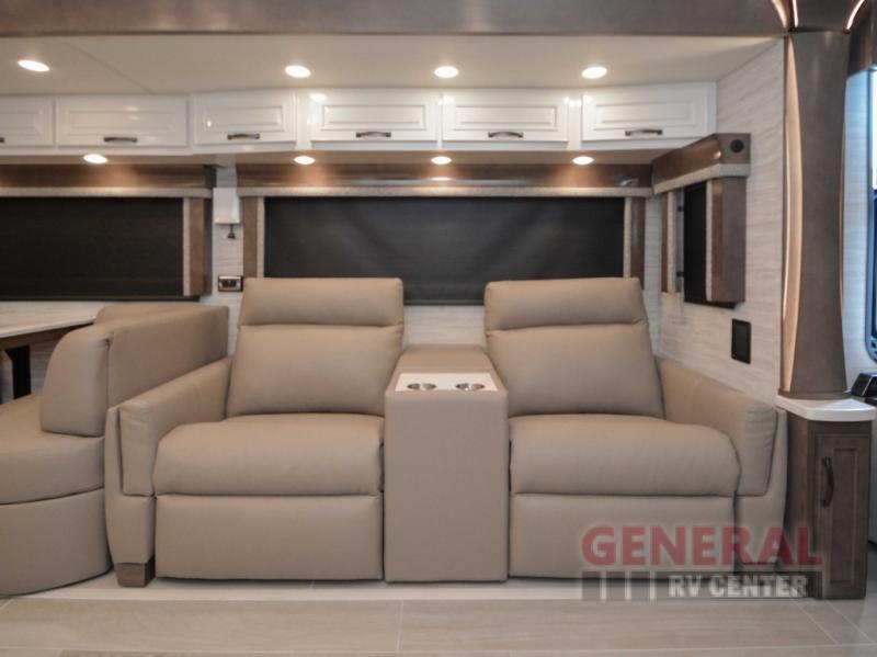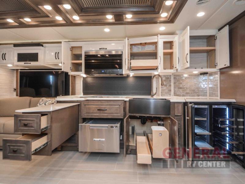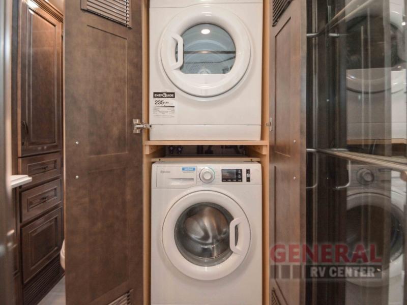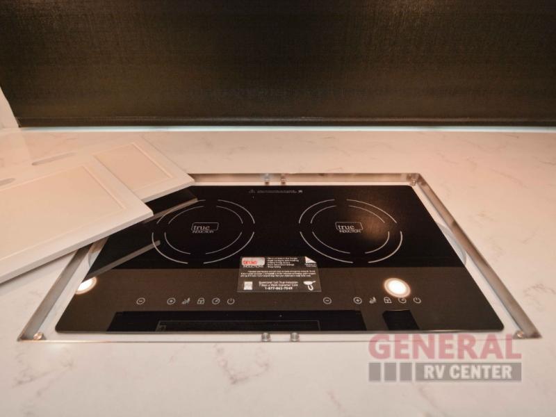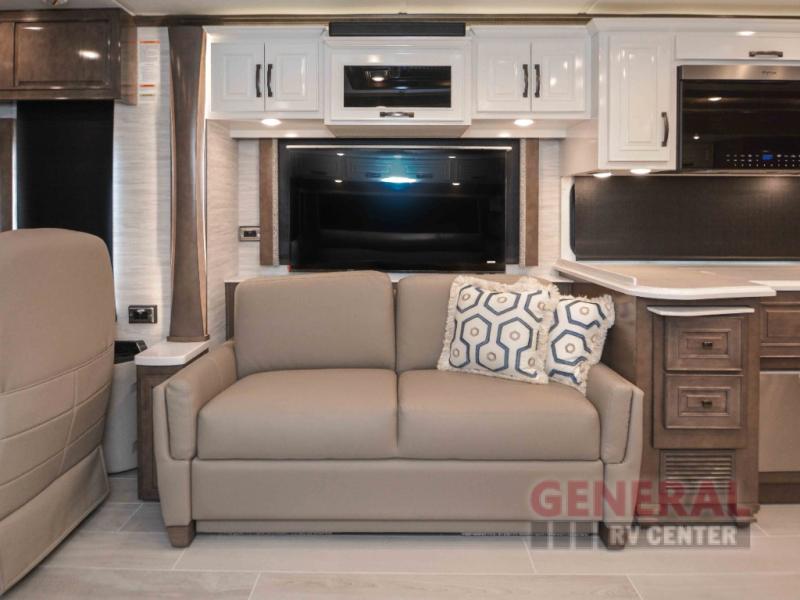 Entertain all year round in this luxurious Dutch Star Class A diesel motorhome! The spacious living room with two sofas leads into a well-equipped kitchen with a Whirlpool refrigerator, all-electric flush mount induction cooktop, and convection microwave with an air fryer feature. A pull-out cabinet beneath the counter offers extra space. All this interior space is possible due to the full-wall slide and two additional slides. At the rear, you'll find a private suite with a king bed, full bath with shower, wardrobes, dual sinks, and space for an optional washer and dryer. An additional half bath means you won't have to share with guests. Specifications shown are with the standard Freightliner tag axle chassis. See dealer for details if optional Spartan K2 tag axke chassis is selected.