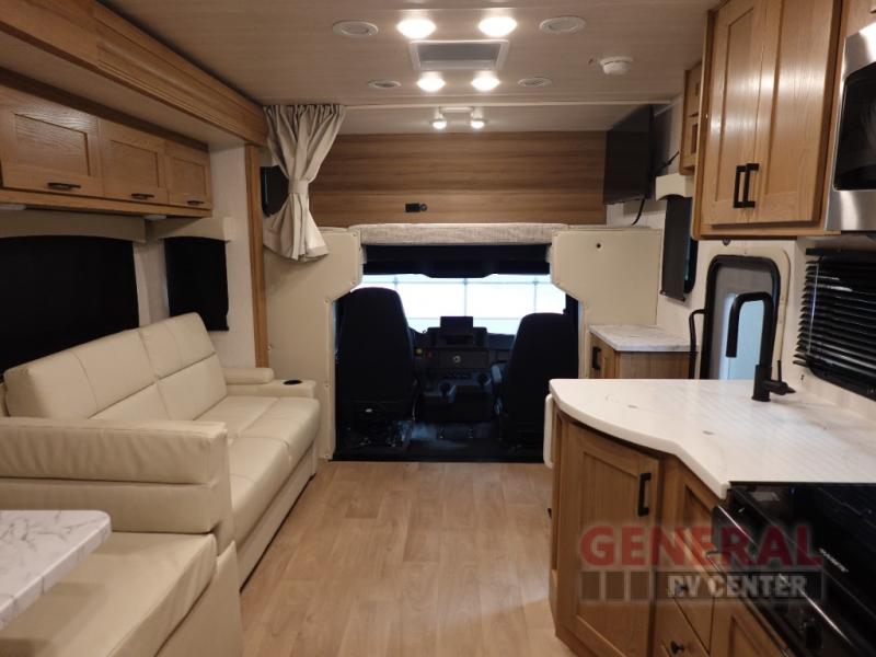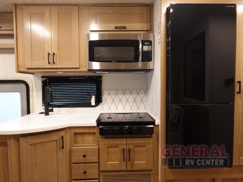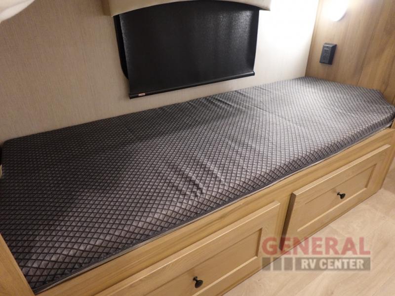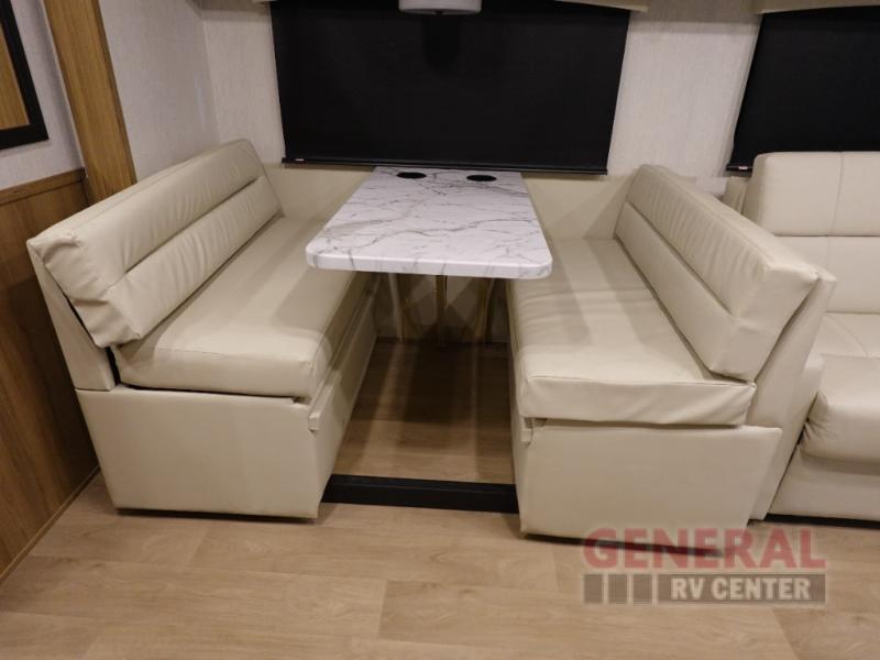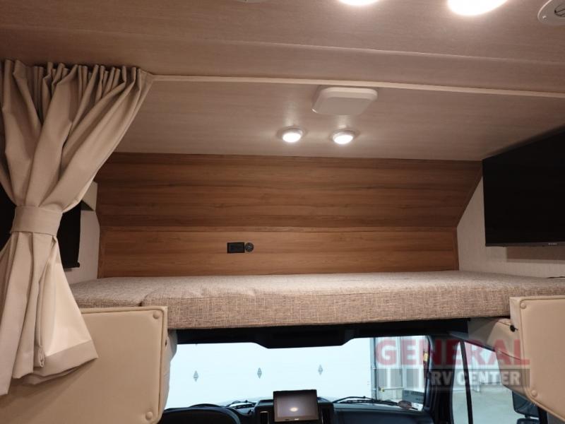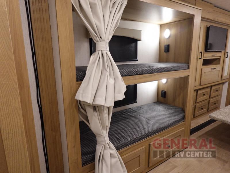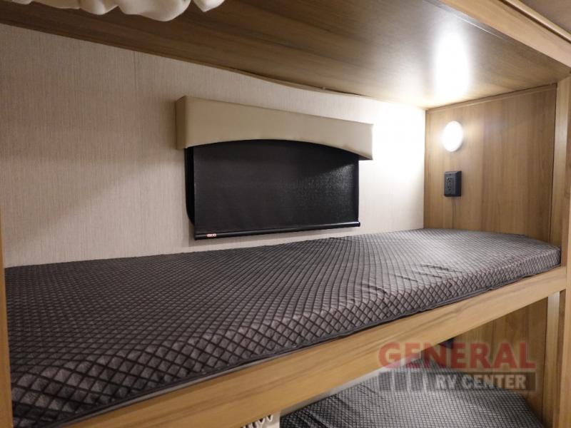 Find your favorite destination and take your favorite people with you in this motorhome! Everyone will have a comfortable place to lay their head at night with a rear 72" x 80" bed, a bunk over cab with a LED TV, the deluxe tri-fold sofa, and set of bunk beds that could be switched out for an optional wardrobe. You could even transform the booth dinette into a sleeping space if needed. After a long day of traveling, clean up in the full bathroom with the shower and enjoy the natural lighting from the skylight above it. Sip on your morning coffee while relaxing in the Euro recliner while bacon is cooking on the three burner cooktop.