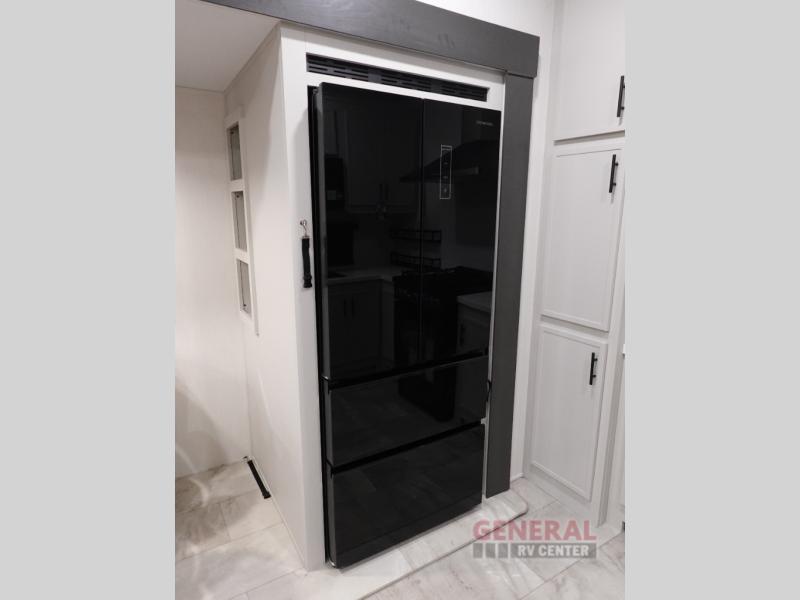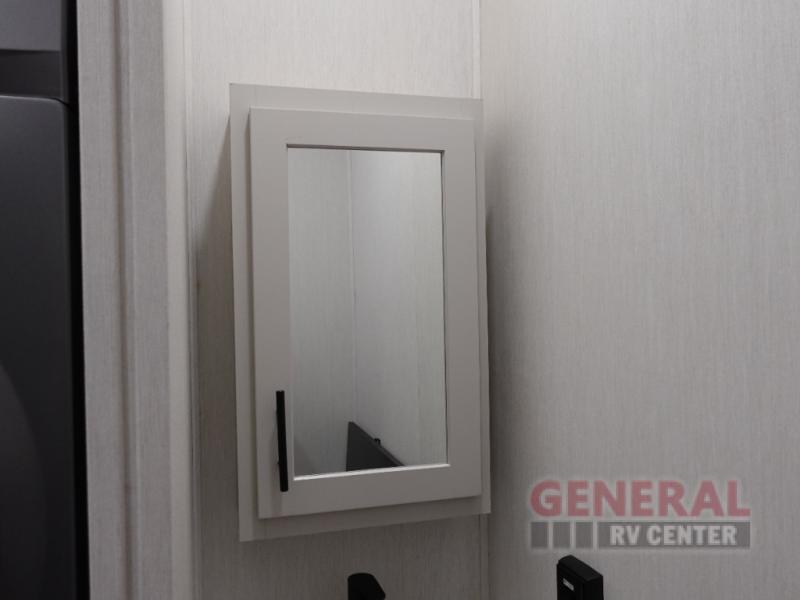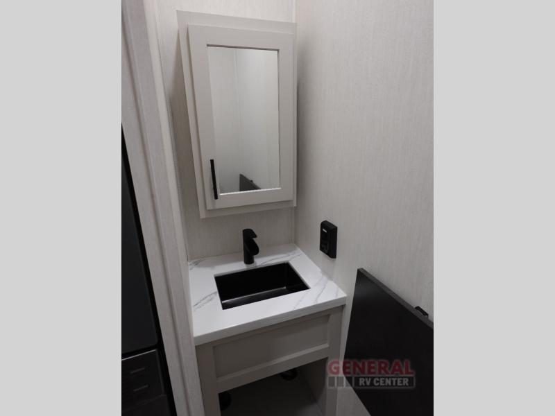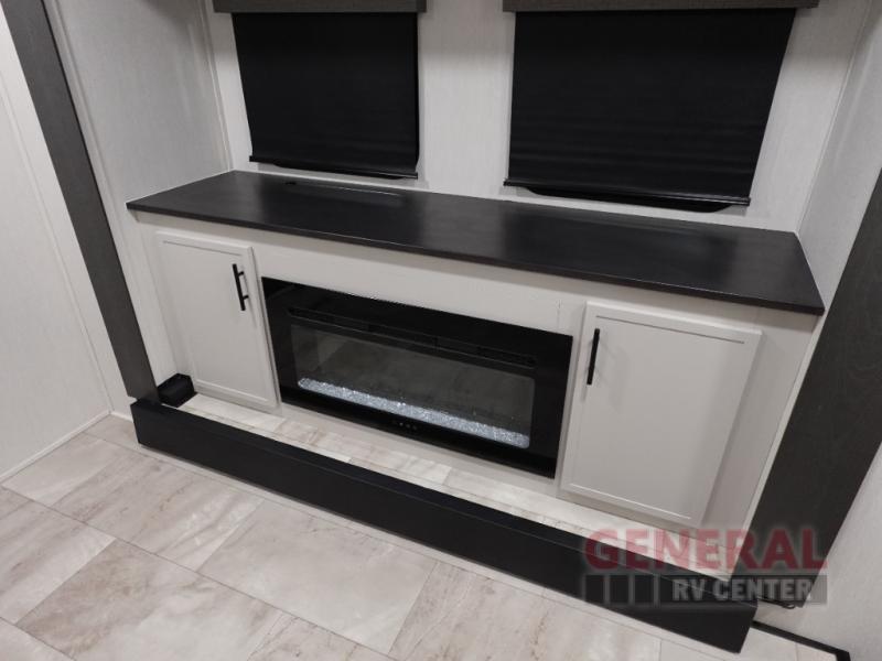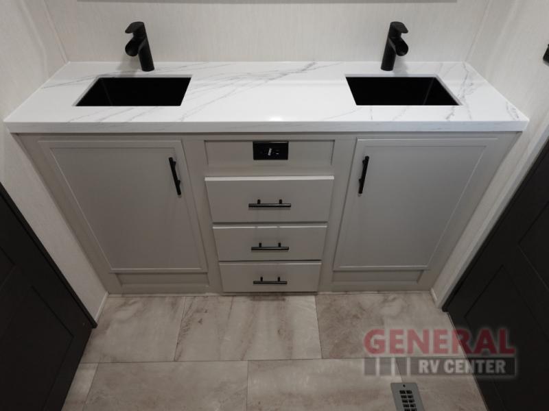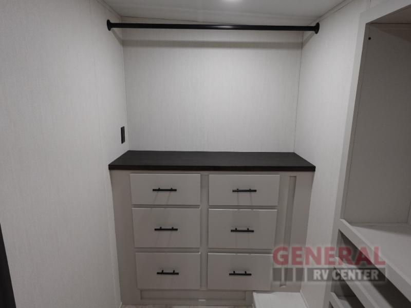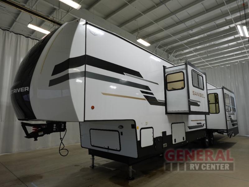 The Sanibel series stands out with a combination of unique and highly functional exterior and interior features designed for both convenience and durability. On the outside, a drop-frame pass-through storage area with a rubberized liner offers ample space while protecting your gear from moisture and wear. Setting up camp is effortless thanks to the one-touch auto-leveling system and rubberized suspension equalizer, which provide a smooth and stable foundation. Inside, comfort meets practicality with carpet less slides for easy cleaning and blackout roller shades for privacy and temperature control. The real wood cabinet doors and solid surface countertops add a touch of elegance, no matter where the road takes you.