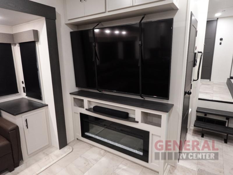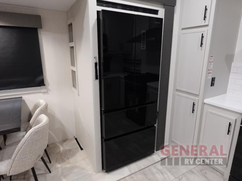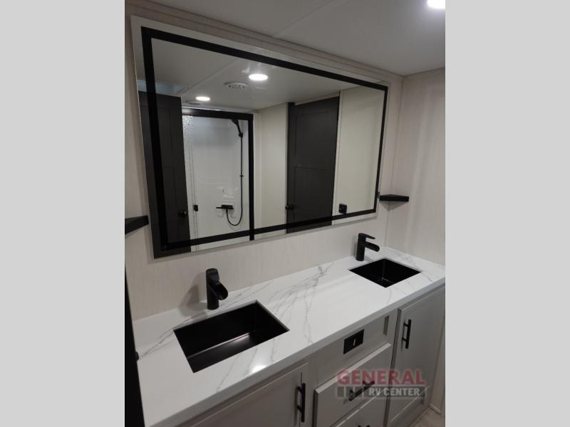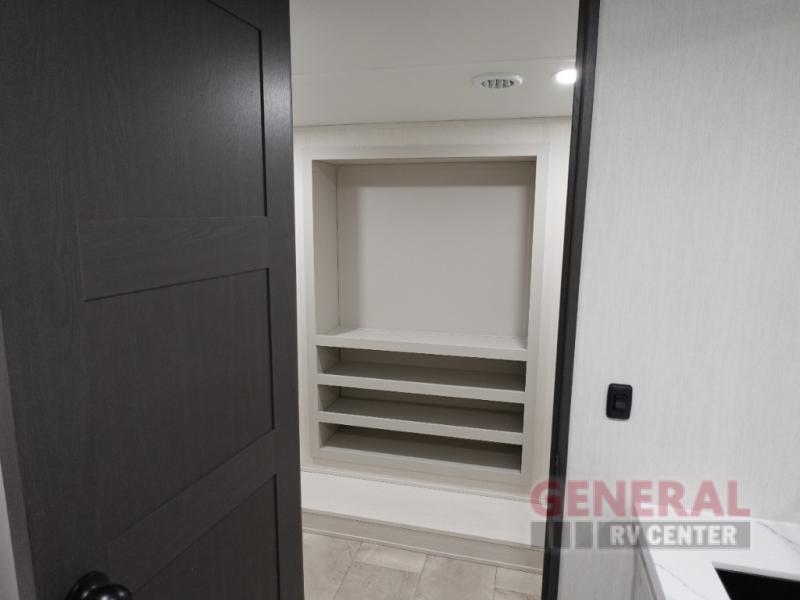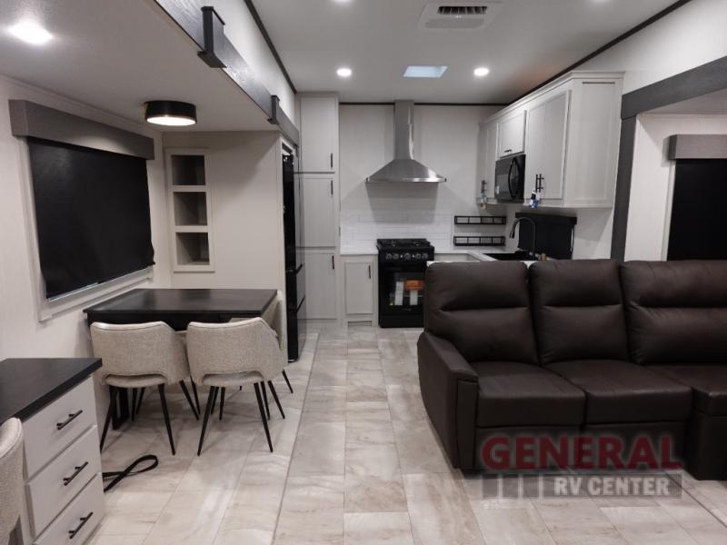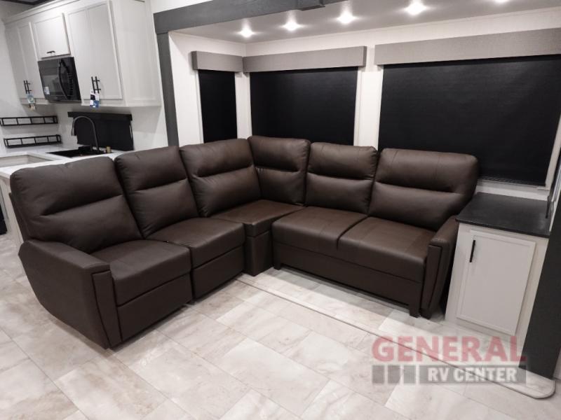 One of the standout features of the 38LAUNDRY fifth wheel is the convenient stackable washer and dryer located in the half bath, letting you take care of laundry right from the comfort of your trailer, no campground laundromat needed. After a day full of outdoor adventures, everyone can relax together in the spacious living room, which features a large sectional sleeper sofa perfect for movie nights or extra sleeping space. The equipped kitchen includes a four-burner range, giving the chef plenty of room to cook up delicious meals with ease. And when it's time to unwind, the private bedroom offers a peaceful retreat complete with a walk-through private bathroom featuring a dual vanity and a generous walk-in closet, ideal for storing all your clothes and camping gear.