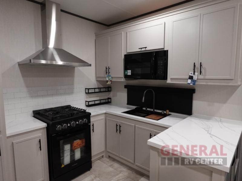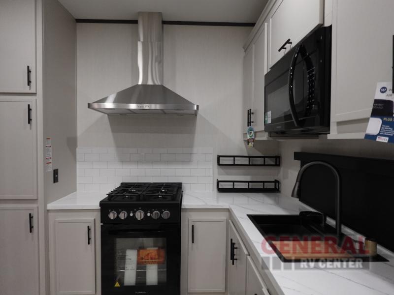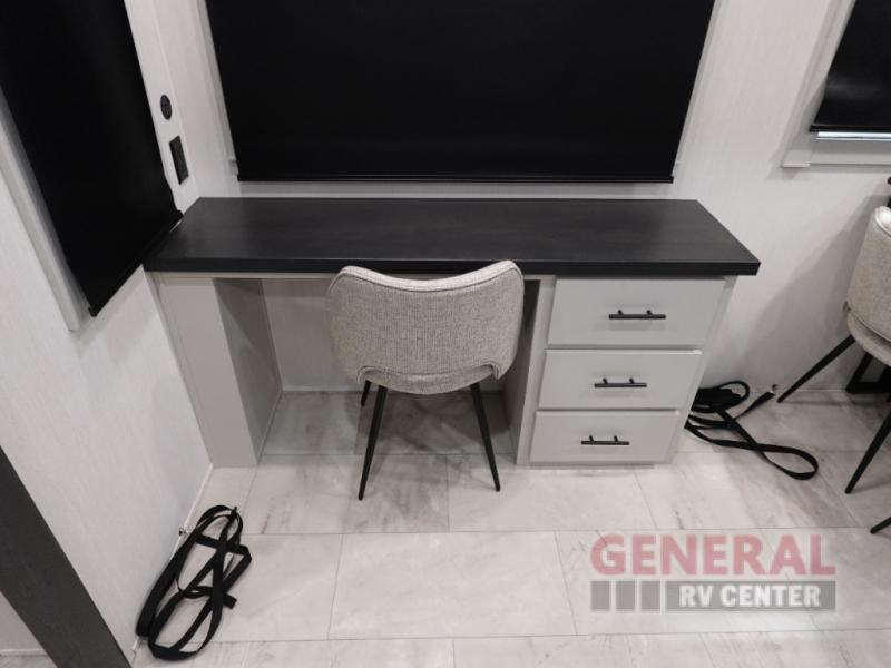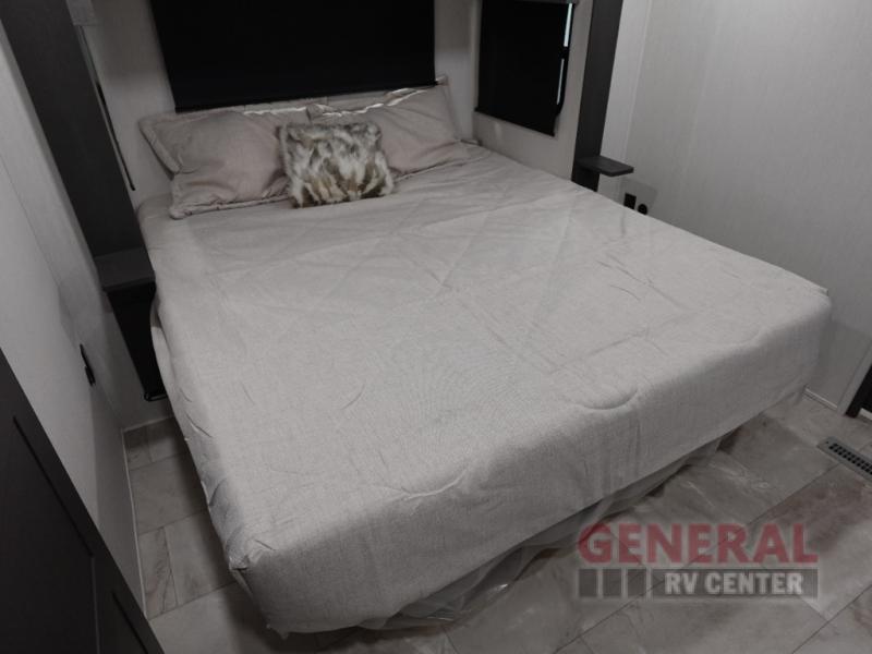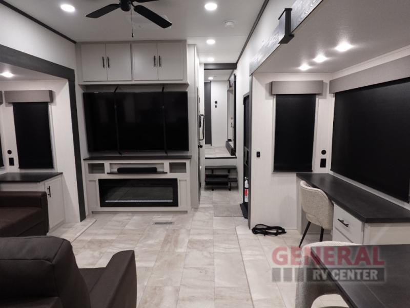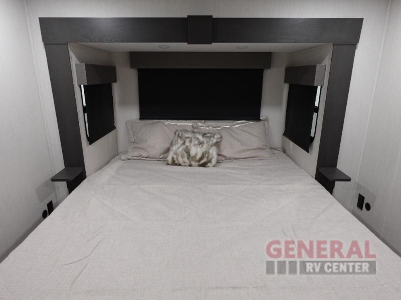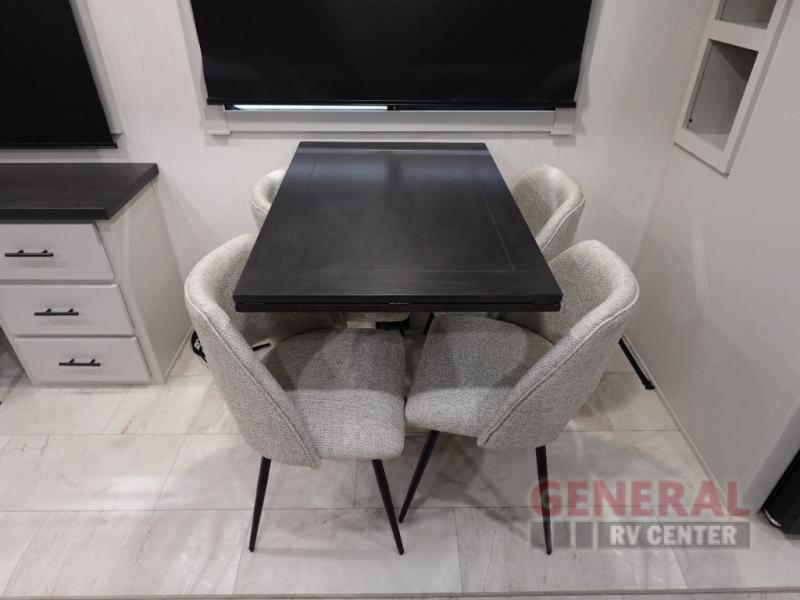 One of the standout features of the 38LAUNDRY fifth wheel is the convenient stackable washer and dryer located in the half bath, letting you take care of laundry right from the comfort of your trailer, no campground laundromat needed. After a day full of outdoor adventures, everyone can relax together in the spacious living room, which features a large sectional sleeper sofa perfect for movie nights or extra sleeping space. The equipped kitchen includes a four-burner range, giving the chef plenty of room to cook up delicious meals with ease. And when it's time to unwind, the private bedroom offers a peaceful retreat complete with a walk-through private bathroom featuring a dual vanity and a generous walk-in closet, ideal for storing all your clothes and camping gear.