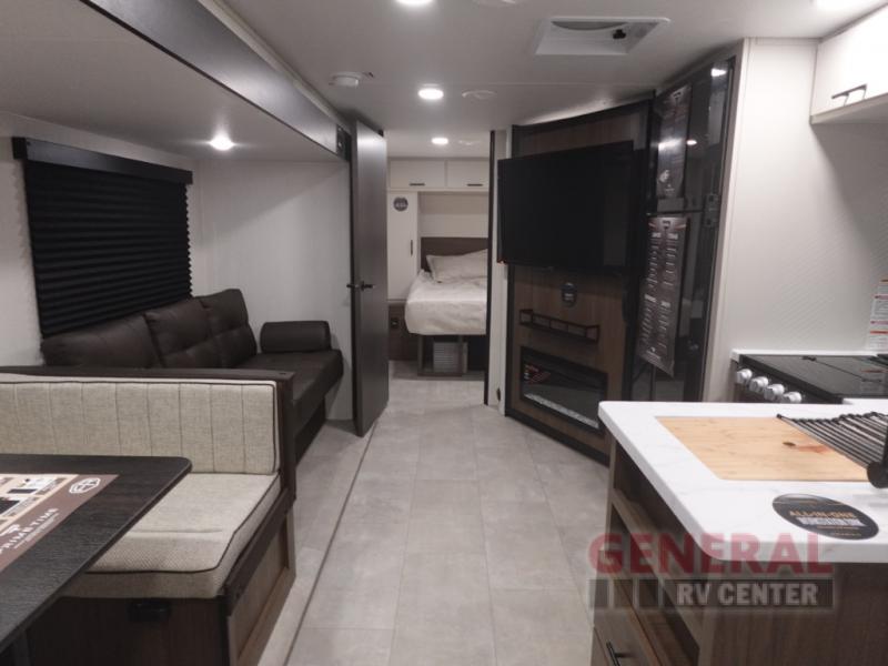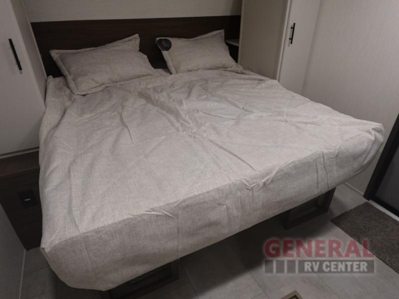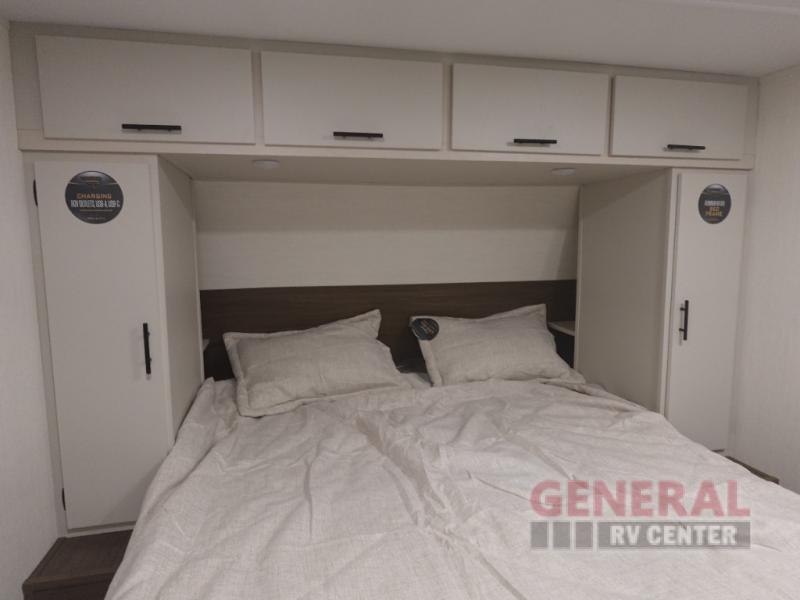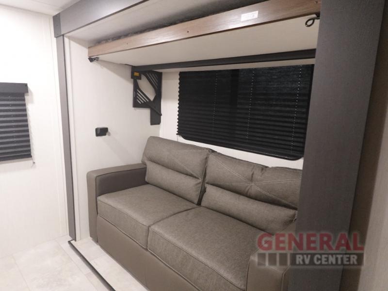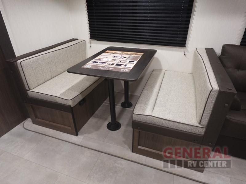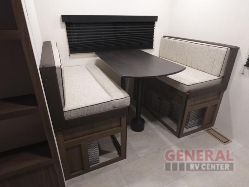 This travel trailer is the best option for a big family! The trailer boasts a spacious bunk bed above a sofa bed, providing ample sleeping space for kids and adults alike. The luxurious front king bed is a serene retreat, featuring expansive wardrobes and overhead cabinets for storing your essentials. The charming booth dinette is a cozy spot for meals or extra sleeping space, as well as the versatile jackknife sofa, which also provides additional sleeping space or a comfortable spot to relax. The sleek entertainment center is perfect for family movie nights. The well-appointed kitchen is equipped with a large fridge, convenient shelves, and a spacious pantry, making meal prep and storage an easy chore. The modern full bathroom features a well-stocked linen closet and provides a convenient space for freshening up. Plus, with two convenient entry/exit doors, this trailer offers added flexibility and ease of use, and the ample overhead cabinets provide additional storage space for your belongings.