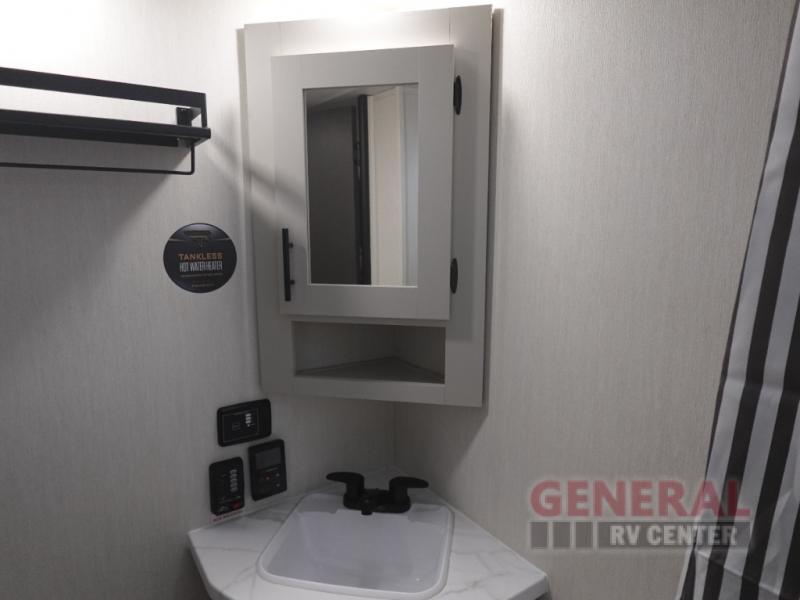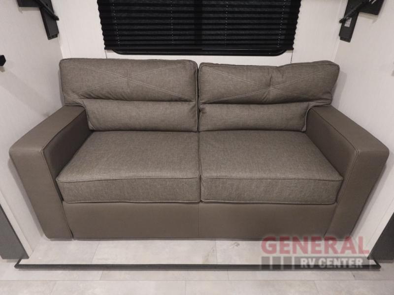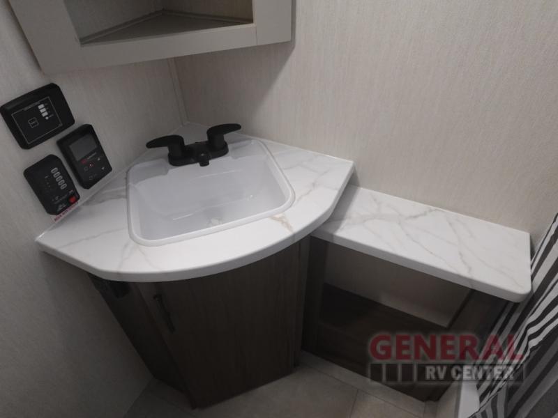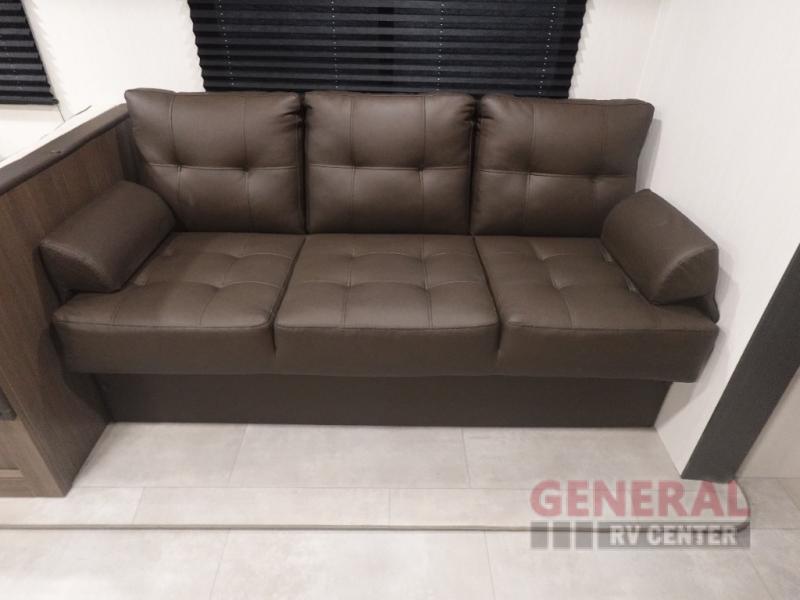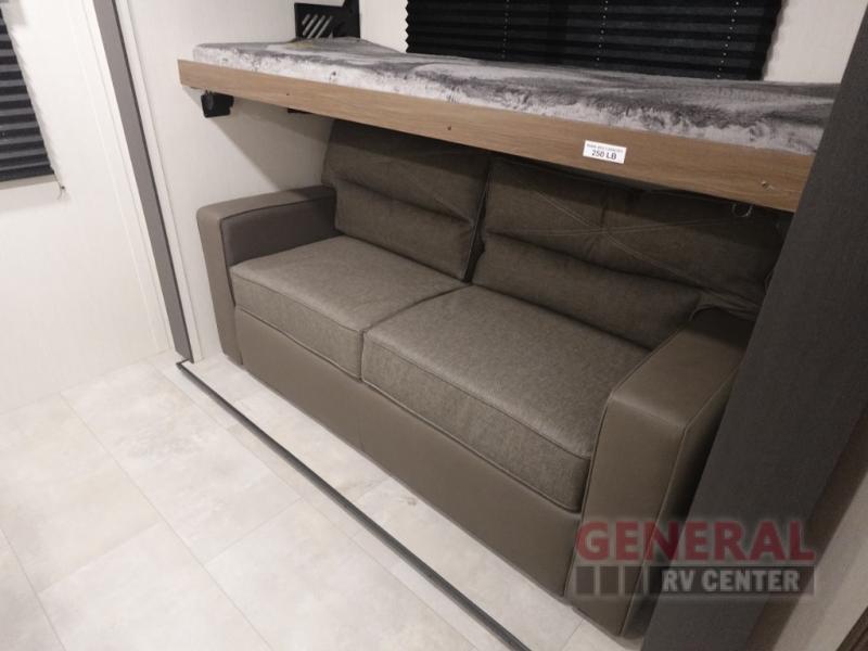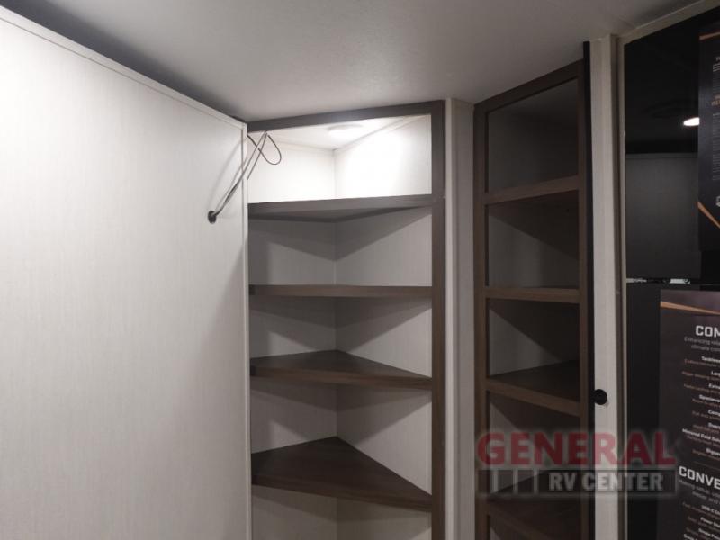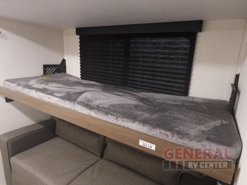 This travel trailer is the best option for a big family! The trailer boasts a spacious bunk bed above a sofa bed, providing ample sleeping space for kids and adults alike. The luxurious front king bed is a serene retreat, featuring expansive wardrobes and overhead cabinets for storing your essentials. The charming booth dinette is a cozy spot for meals or extra sleeping space, as well as the versatile jackknife sofa, which also provides additional sleeping space or a comfortable spot to relax. The sleek entertainment center is perfect for family movie nights. The well-appointed kitchen is equipped with a large fridge, convenient shelves, and a spacious pantry, making meal prep and storage an easy chore. The modern full bathroom features a well-stocked linen closet and provides a convenient space for freshening up. Plus, with two convenient entry/exit doors, this trailer offers added flexibility and ease of use, and the ample overhead cabinets provide additional storage space for your belongings.