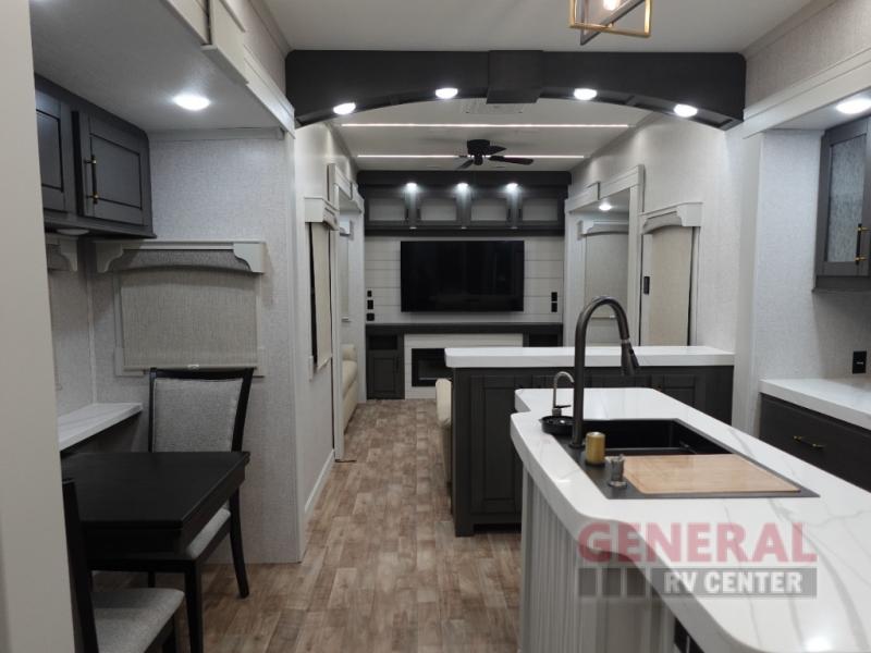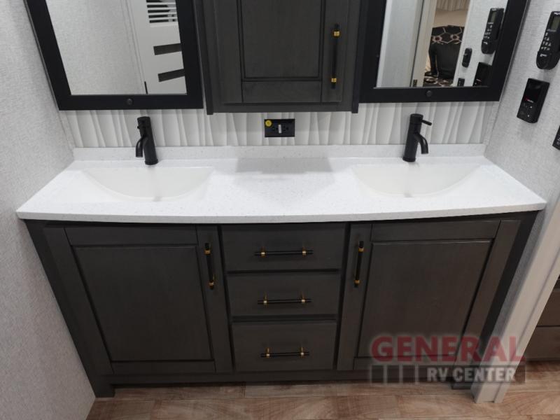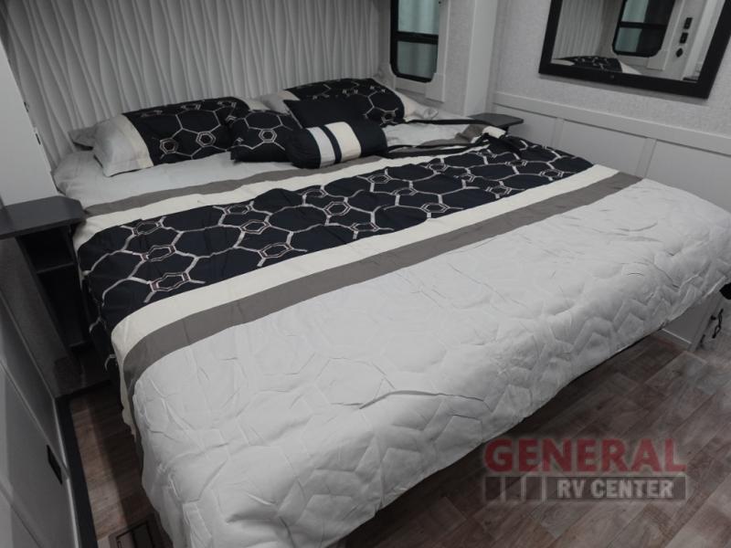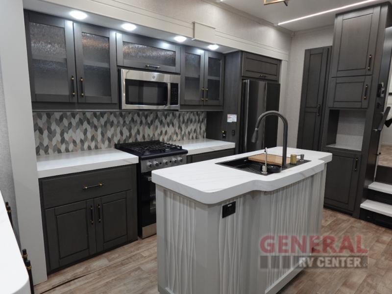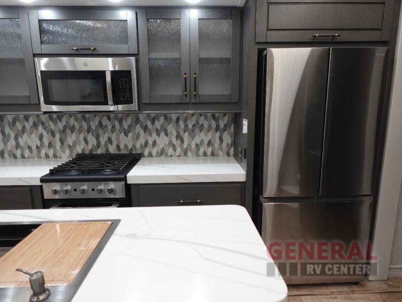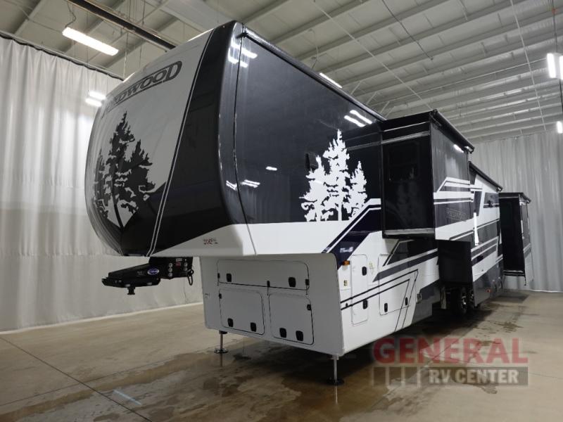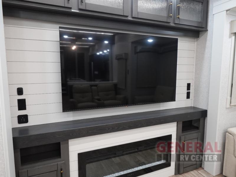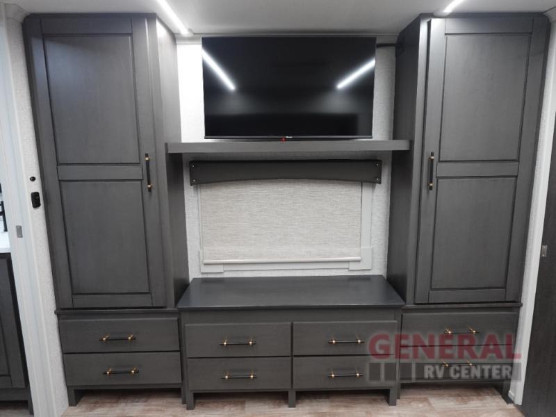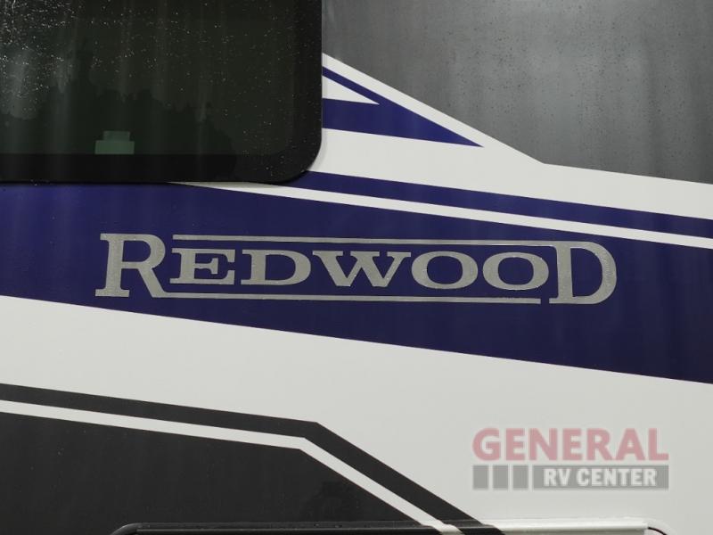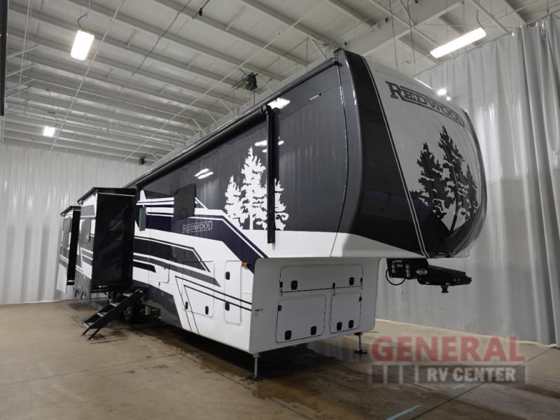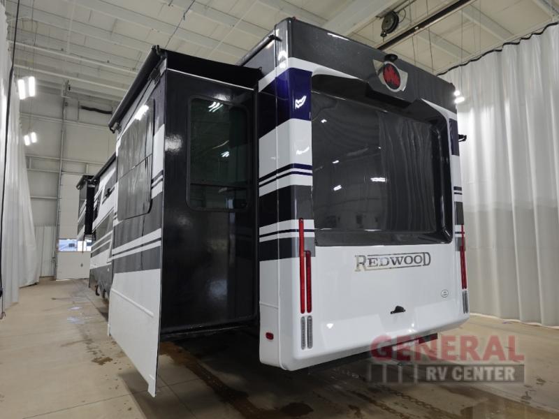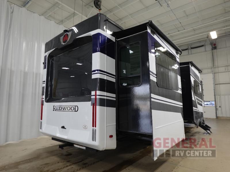 This Redwood fifth wheel is going to make you say wow! The rear living room is fully impressive with its 72" tri-fold sofa slides that are across from one another, its 60" theater sofa, entertainment center with 65" TV, and its ceiling fan. All in all, it will feel like you're lounging back at home. The kitchen is also completely decked out with opposing slides, a pull-out waste basket at the large island, two buffets, a pantry, and a message center, and just a few steps away from the kitchen is where you will find the luxurious master suite. This space has a full bathroom up at the front where you will find a huge walk-in closet, and within the bedroom, the king bed slide rests across from the 39" TV so that you can watch a movie in comfort.
