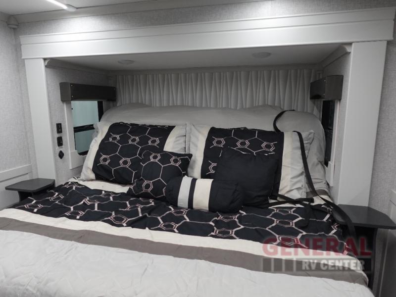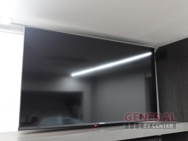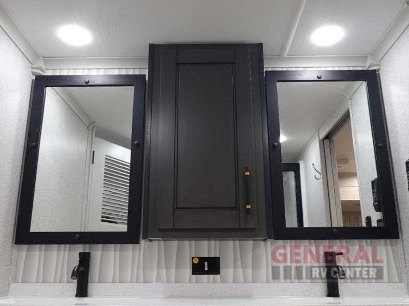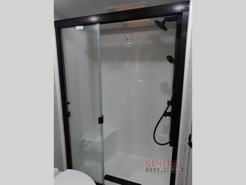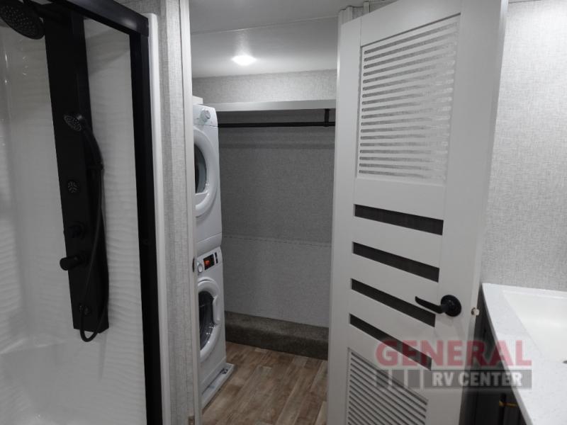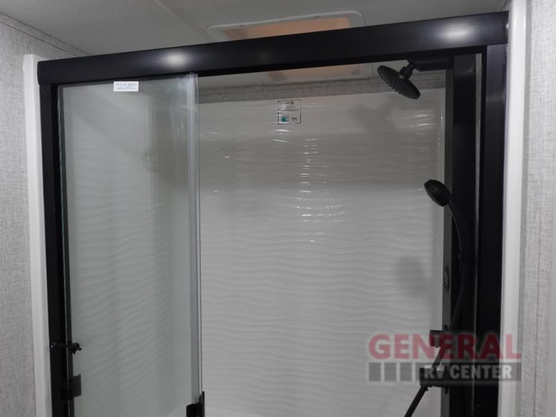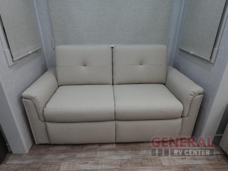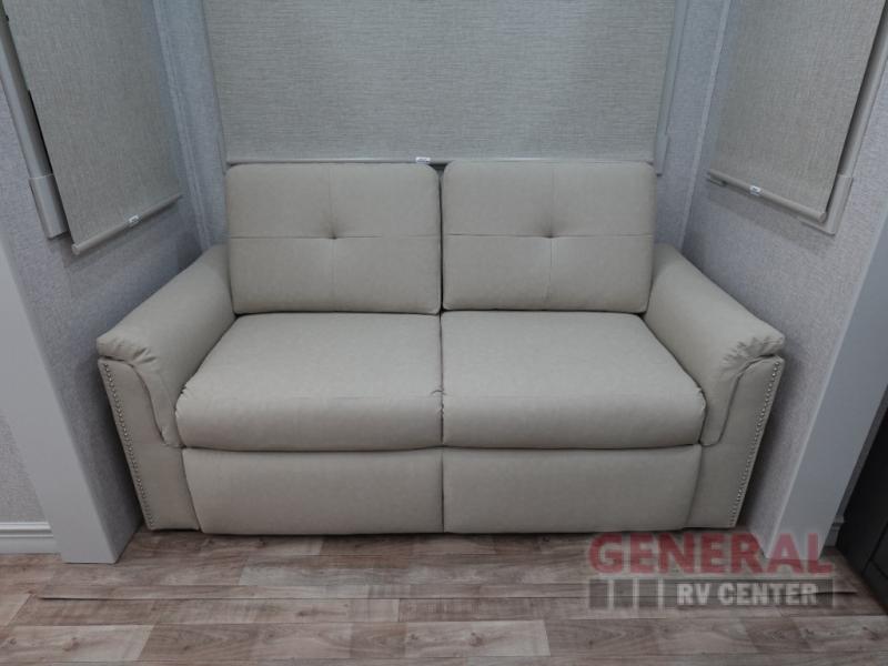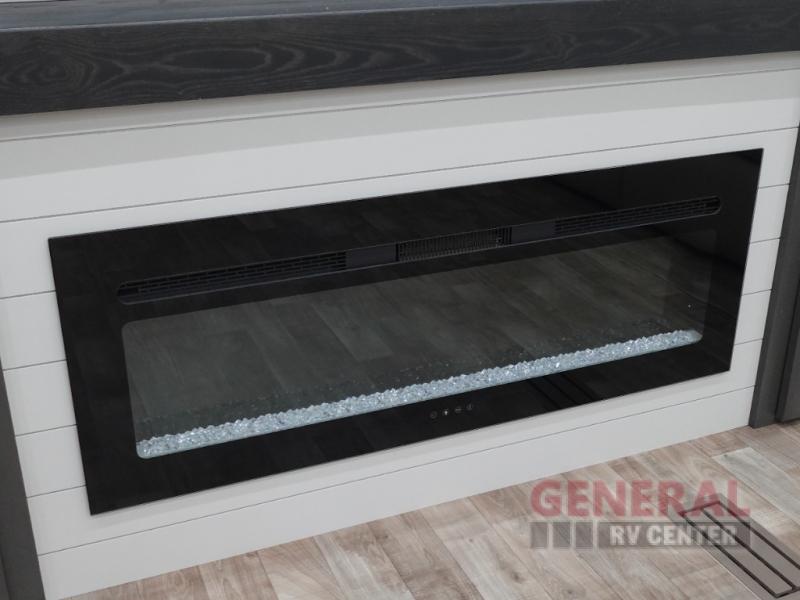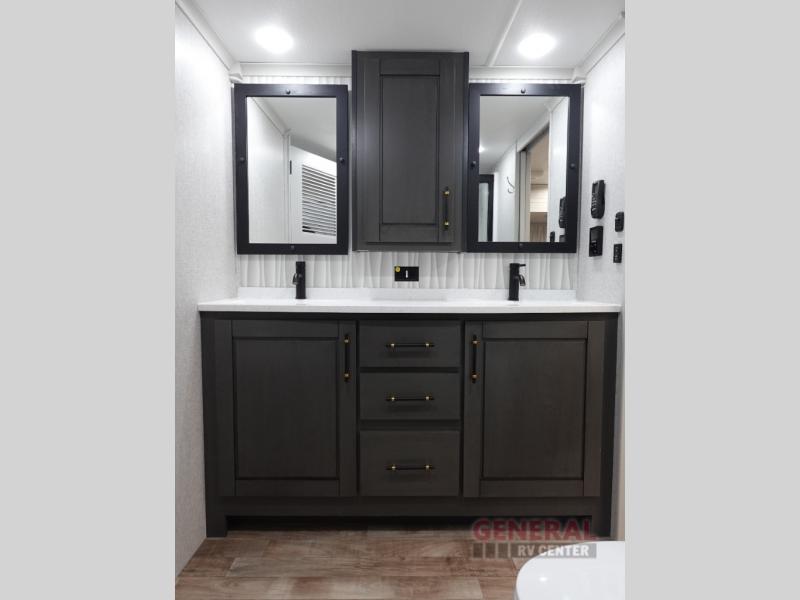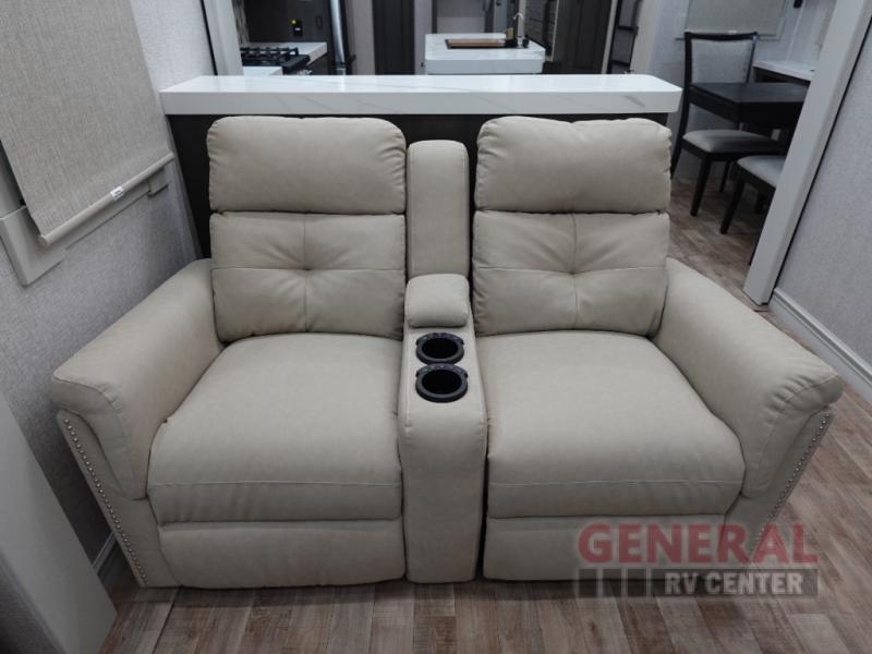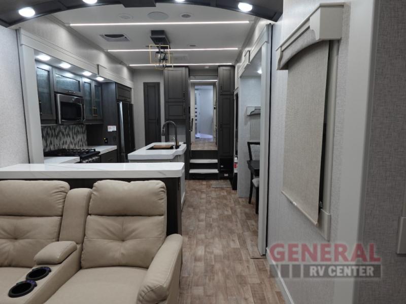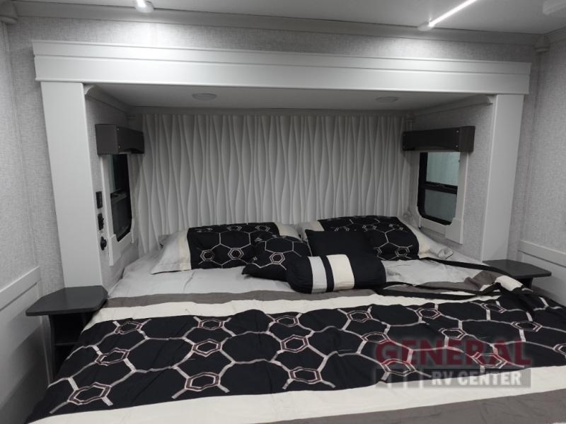 This Redwood fifth wheel is going to make you say wow! The rear living room is fully impressive with its 72" tri-fold sofa slides that are across from one another, its 60" theater sofa, entertainment center with 65" TV, and its ceiling fan. All in all, it will feel like you're lounging back at home. The kitchen is also completely decked out with opposing slides, a pull-out waste basket at the large island, two buffets, a pantry, and a message center, and just a few steps away from the kitchen is where you will find the luxurious master suite. This space has a full bathroom up at the front where you will find a huge walk-in closet, and within the bedroom, the king bed slide rests across from the 39" TV so that you can watch a movie in comfort.
