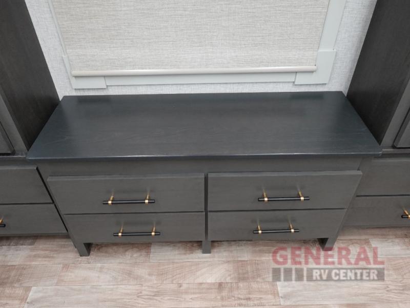 You are going to wish you found the Redwood fifth wheels sooner! With all of the residential comfort and modern luxury, you will be impressed. The Williamsburg Furniture Collection includes two premium dinette chairs, a buffet-style adjustable dinette with leaf extension, a residential-style sofa, and powered theater seating. The luxury further extends to the bedroom where you will find a gel-foam king bed with tilt and C-PAP shelves on both sides of the bed. The straight roof line gives a luxury profile, and there are preparations for a wireless backup camera as well as solar power. The seamless residential insulated heat ducts will efficiently heat your unit, and there is an exterior radio in the fully finished and heated pass-through with slat board storage.