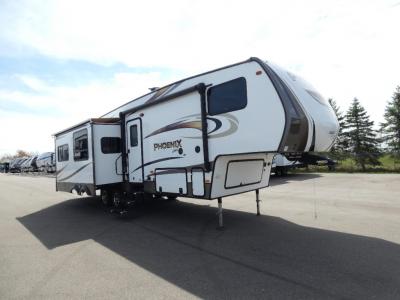 Stand out from all the others with one of these Shasta RVs Phoenix Lite fifth wheels! They are constructed with Weather Shield+ technology, dual-sided Azdel composite sidewall panels, and Tri-Tex powder coated frame technology that is ultra weather resistant. There are also electric front jacks and electric rear stabilizer jacks, an electric awning with LED light strip and one hand pitch adjustment, and a roof mounted solar panel within the Solar Source+ Package. The interior includes USB charging ports, slow rise blackout roller night shades, and a large transom window in the kitchen. You will also enjoy the upgraded GE 13,500 BTU dual ducted main A/C to keep you comfortable throughout your fifth wheel, plus an upgraded 60K BTU on-demand water heater for endless hot showers!