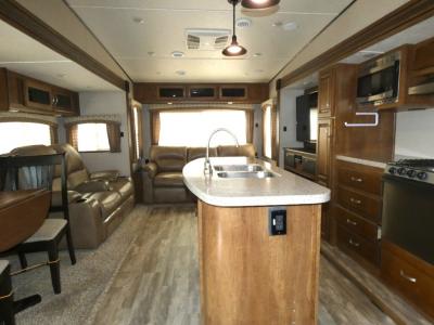 Start camping in true luxury with this fifth wheel! The chef will appreciate having a kitchen island with two barstools to sit at while they prepare dinner. Eat your meals and play card games at the table and chairs, then relax in the rear living area on either the 78" tri-fold hide-a-bed sofa or theater seating across from the fireplace and TV. The dual entry bathroom has a radius shower to freshen up in and leads directly into the front private bedroom with a queen bed and wardrobe/linen closet slide to keep your items looking their best!