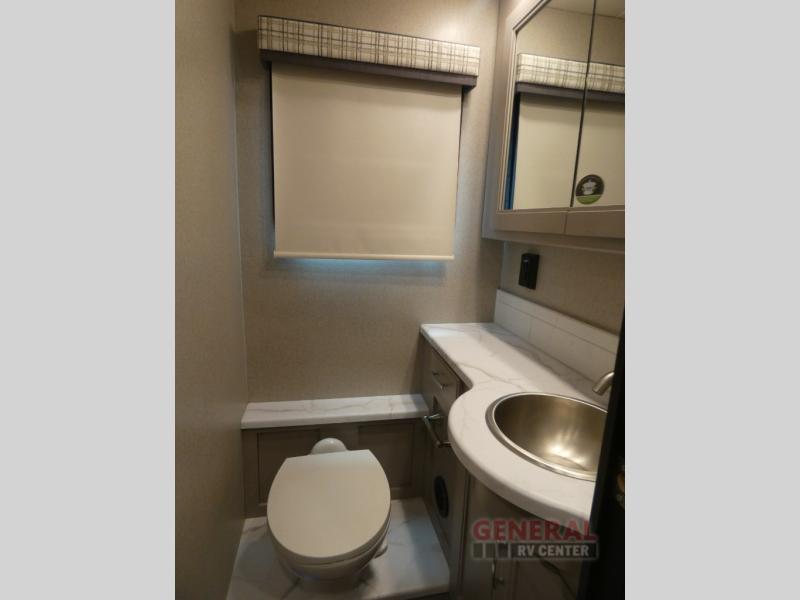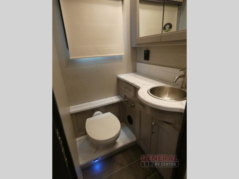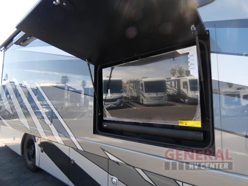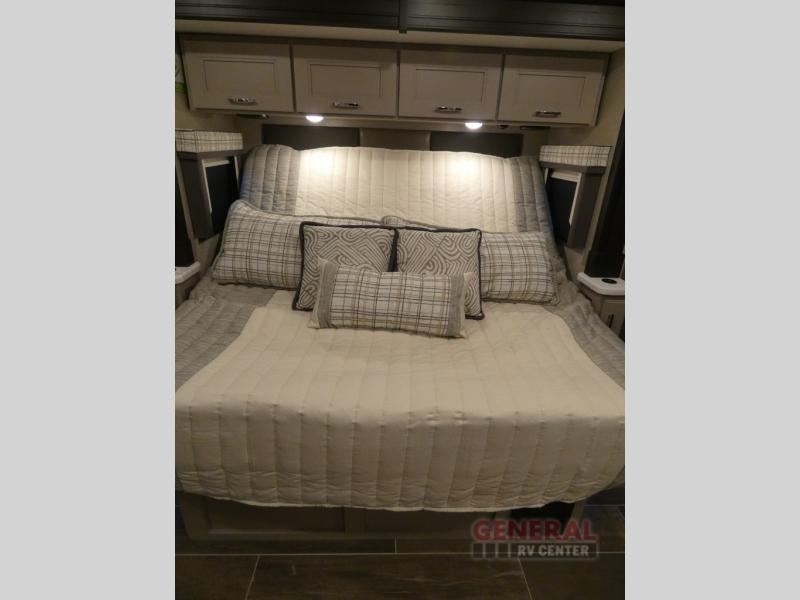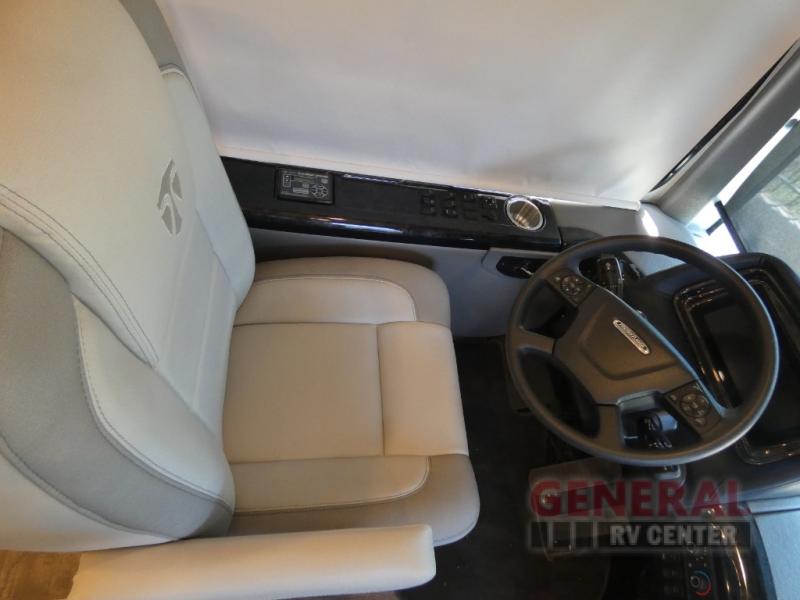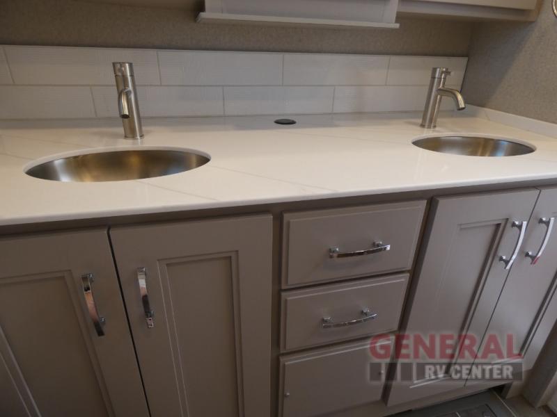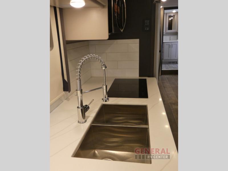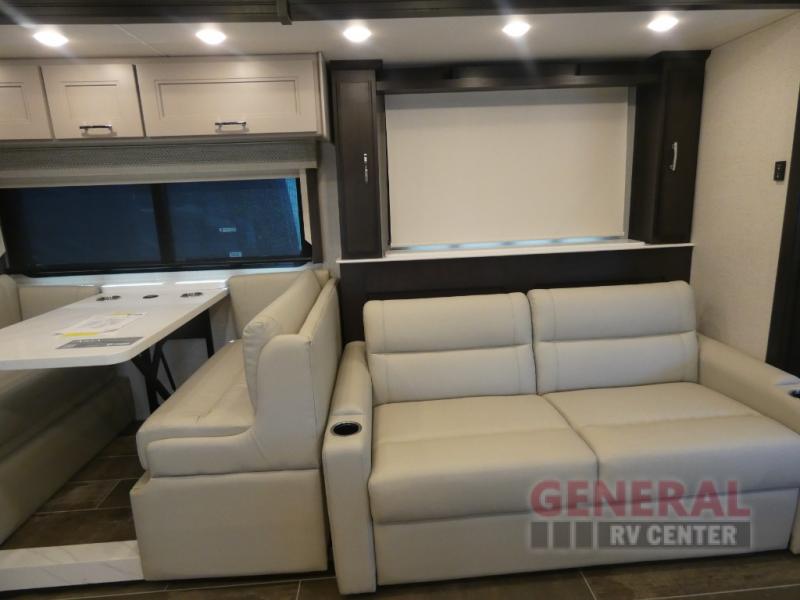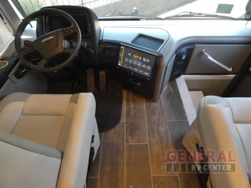With any Aria Class A diesel motorhome by Thor Motor Coach, experience RV living with all the luxurious amenities you are accustom to, command the roadways with improved handling from the VFS front axle with a 55-degree wheel cut, and enjoy a smooth ride thanks to the Air-Ride suspension and Sachs shock absorbers. The driver will also appreciate the 10.1" touchscreen dash radio with Bluetooth, and Sirius/XM prep when navigating the roads, and the comfort of the leatherette reclining/swivel adjustable captain's chairs. The bathroom provides an oversized full height shower with a glass door and a designer backsplash, while the kitchen provides solid surface countertops and a dinette. You'll also enjoy designer tile backsplash, a large double bowl stainless steel sink with a single handle faucet, a pull-down sprayer, plus full kitchen amenities. More standout features include the Wyndham cabinetry with rake style cabinet doors & nickel finish hardware, plus much much more depending on the Aria you take on the road!
