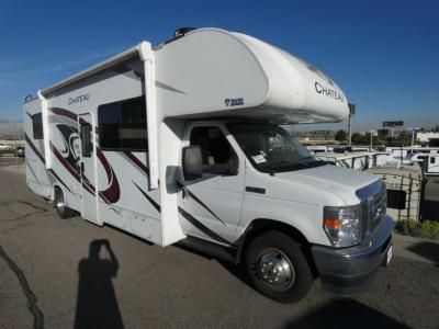 Experience a smooth ride to each destination with the Thor Motor Coach Chateau Class C gas motorhomes! There is a Ford E-Series chassis and each model includes an 8,000 lb. trailer hitch to bring the family car along. They are constructed with a welded tubular aluminum roof, sidewall cage construction, vacu-bond laminated roof, walls, and floor with block foam insulation to keep the heat and air conditioning inside. The slick fiberglass exterior with graphics package and black framed windows are sure to turn heads down the highway too. Inside, you'll be met with residential vinyl flooring, premium window privacy shades, a power bath vent, and pressed laminate kitchen countertops. There is even a tankless water heater for endless hot showers, a 4.0 kw dual gas/LP generator to keep you going, and a 100-watt solar charging system for off-grid capabilities!