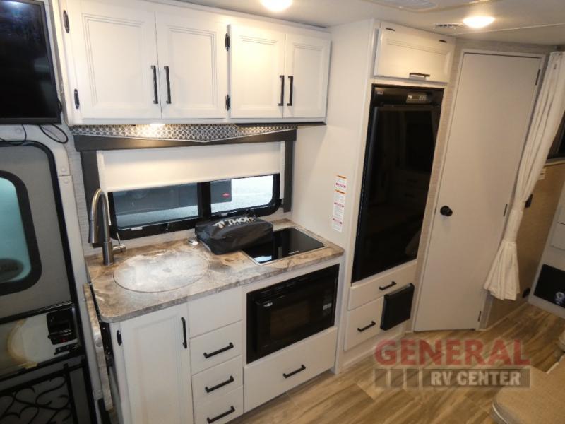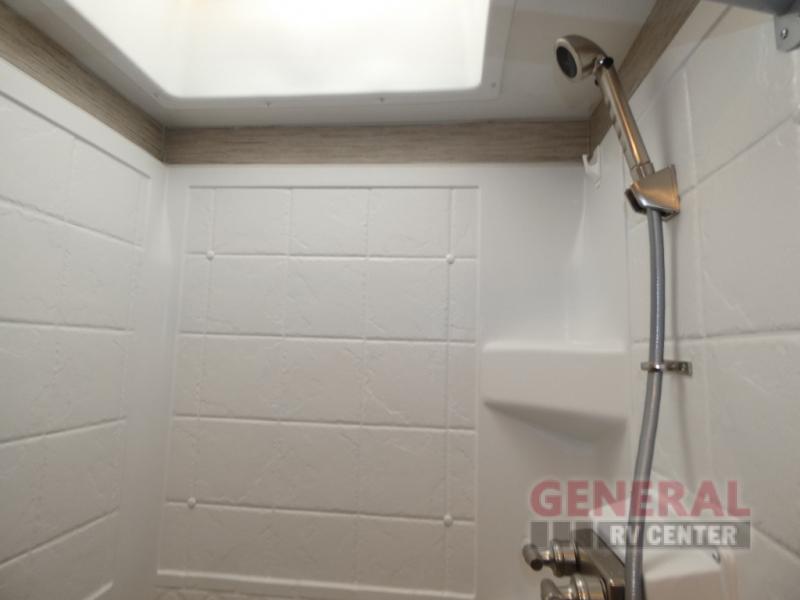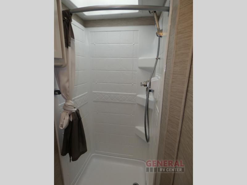 You will have everything you need in this motorhome for a comfortable trip! Create your own private bedroom with privacy curtain to close off the flip-up RV queen bed with cushioned seating underneath, the wardrobe, and the 32" TV. You can prepare delicious home cooked meals with the electric start two burner gas cooktop, keep your perishables fresh in the 12V dual door refrigerator, and enjoy your meals at the 68" dream dinette. There is also an entryway 32" TV to watch your favorite movies and a built-in skylight for more natural lighting. Start and end your days feeling squeaky clean in the rear corner bathroom with the 24" x 32" shower!