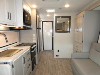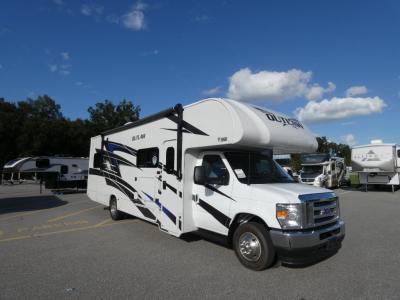 The Outlaw Class C gas motorhome toy hauler starts with the durable Ford E-Series chassis with a powerful 7.3L V8 engine that will allow you to adventure on! The 8,000 lb. hitch will be perfect for your car or motorcycle trailer, and the 10" touchscreen with a back-up monitor will let you maneuver the campground like a pro. This coach includes a Winegard ConnecT 2.0 WiFi/4G/TV antenna for all your connection needs, or you may want to unplug for a while with the 100-watt solar charging system with a power controller. The one-piece fiberglass front cap and sterling fiberglass exterior with a graphics package is sure to be eye-catching, and automatic leveling jacks come standard for easy set-up. Head inside to find pressed laminate countertops throughout, leatherette furniture, residential vinyl flooring, plus many more comforts you won't want to travel without!