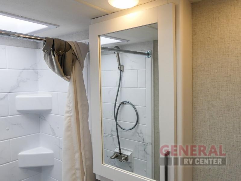 It won't be hard to find comfort in this coach for five! You can freshen up in the rear corner full bath once you've set up camp, then make lunch on the two burner gas cooktop or convection microwave with an air fryer. There is also a 12V refrigerator for cold items and a flip-up countertop for more space. Whether you dine at the Dream Dinette or take your plate outdoors under the 15' power awning, you're sure to have a great time in this motorhome. The rear corner full-size bed will provide a comfy place to rest your head at night, while your guests take the dinette and cab-over bunk!