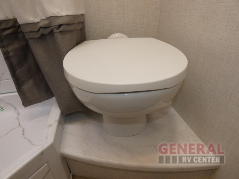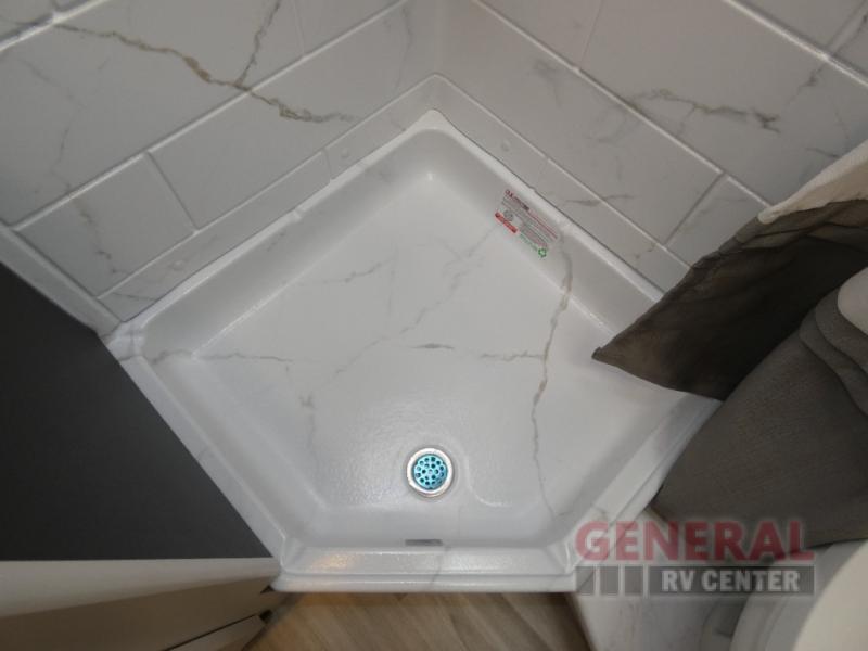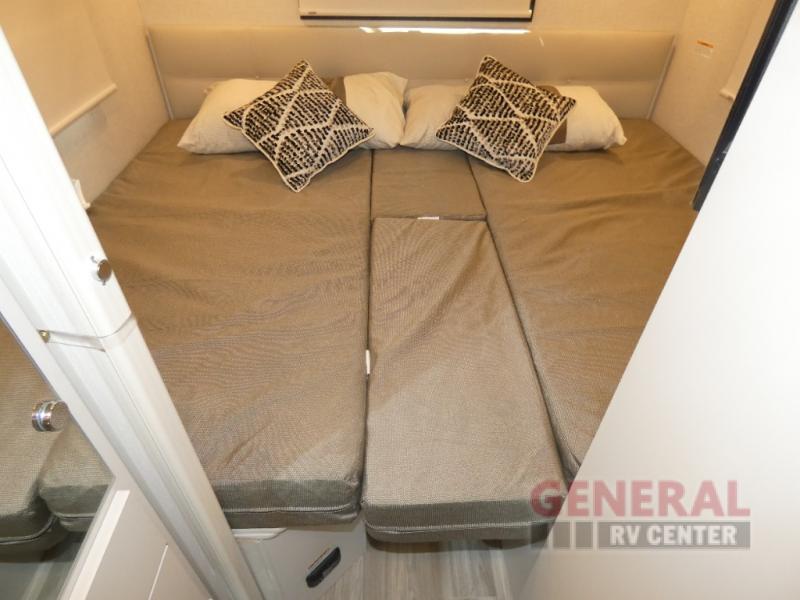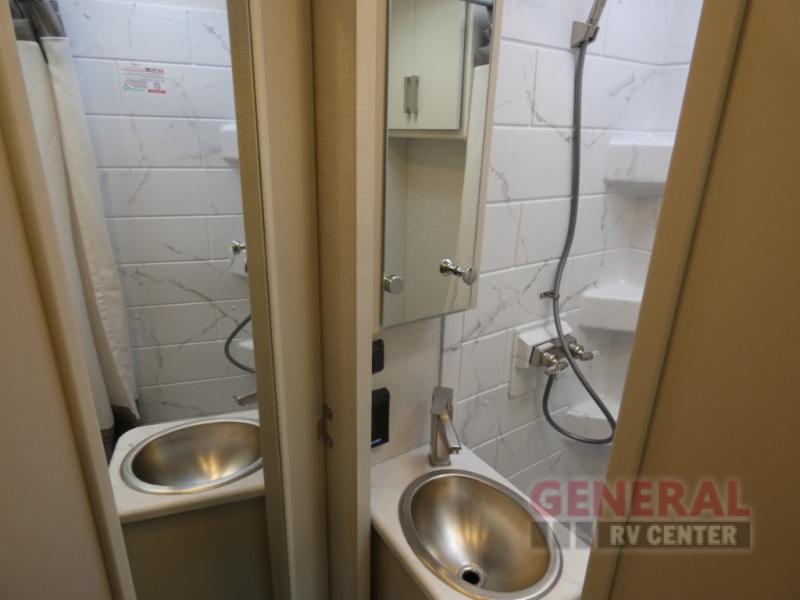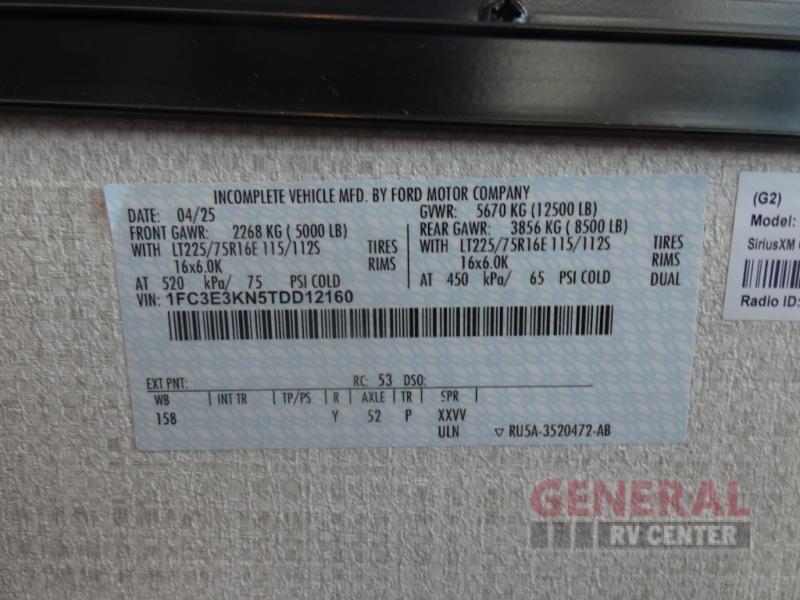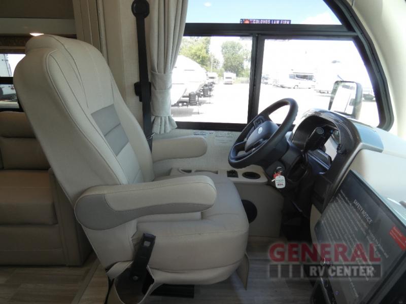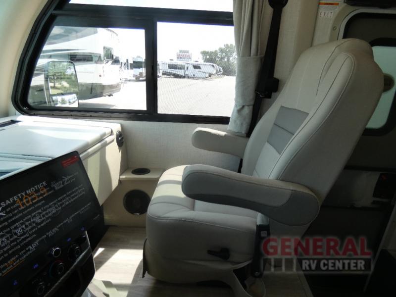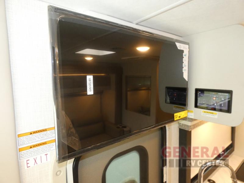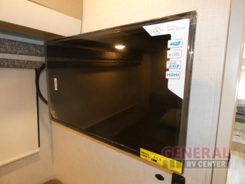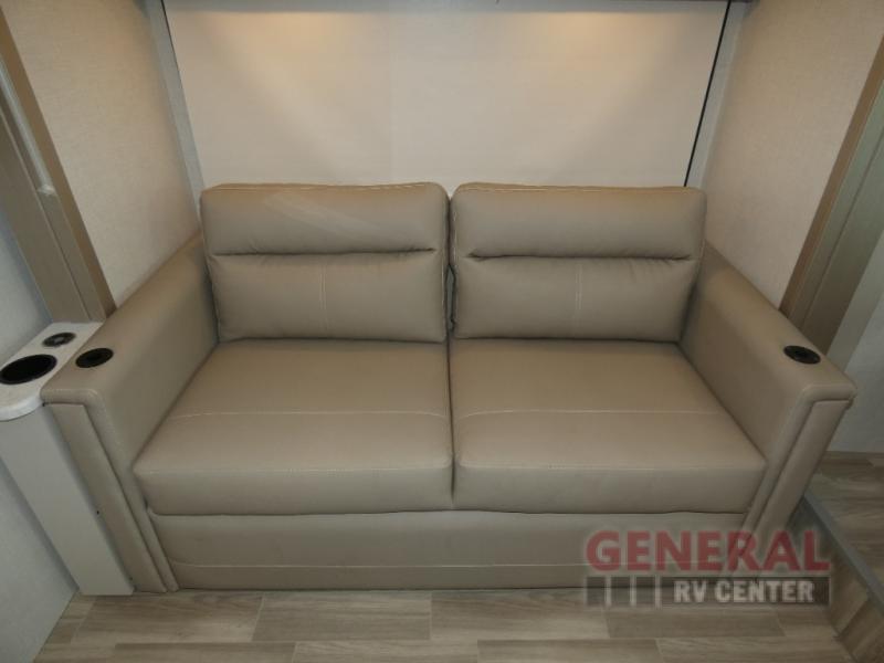 The front cab of this Vegas Class A gas motorhome is excellently appointed with a stow-away coffee table, reclining/swivel leatherette captain's chairs, and a 14" touchscreen dash radio with Bluetooth, Android Auto, and Apple CarPlay! A single slide holds the 68" sofa bed so that it isn't in your way as you walk back to the semi-private bedroom. The kitchen offers you a two burner cooktop to sauté veggies, and there are two Smart TVs to provide you with all the entertainment you could need. Within the full bath you'll find a 27" x 27" radius shower with a skylight, a stainless steel bath sink, and a 12V power bath vent to keep this space fresh.