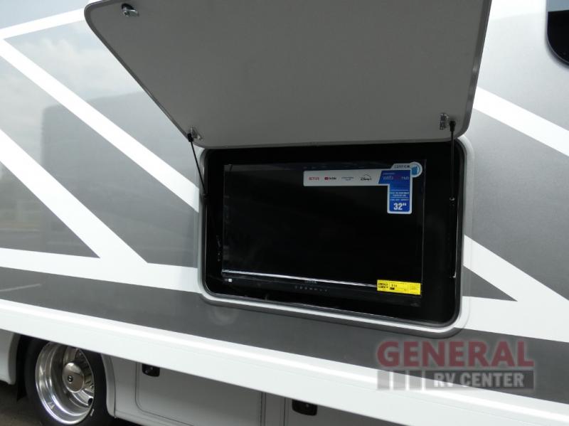 This Windsport Class A gas motorhome is exactly what you'll need to have enjoyable vacations with the family! The main living area is decked out with comfort. First of all, it offers you more space because of the slide out, and this slide out is what holds the 68" Dream Dinette, 68" sofa bed, and 50" LED Smart TV. Second, there is even more lounge space with the theater seating with footrests that sits across from the dinette and sofa bed. And on top of all of that, you'll also have a second LED Smart TV in the living room, so you can have a surround sound experience and multi-view entertainment while watching a movie. The private bedroom also offers great comfort with its king bed and 32" LED Smart TV, and there is more entertainment outside with the exterior 32" TV.