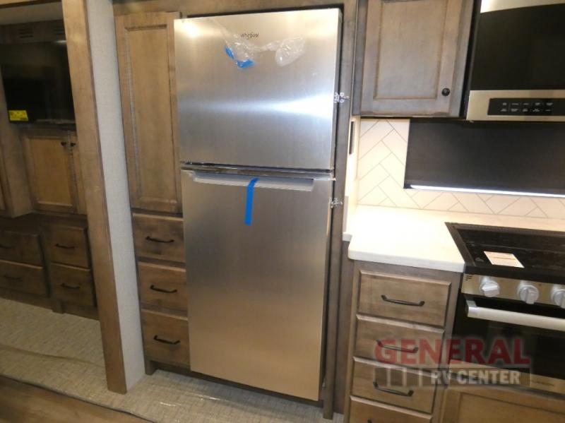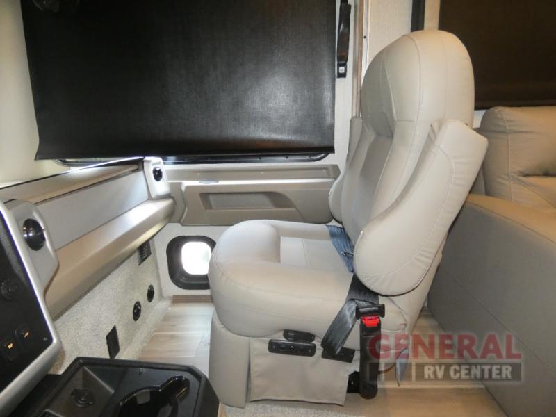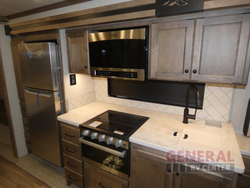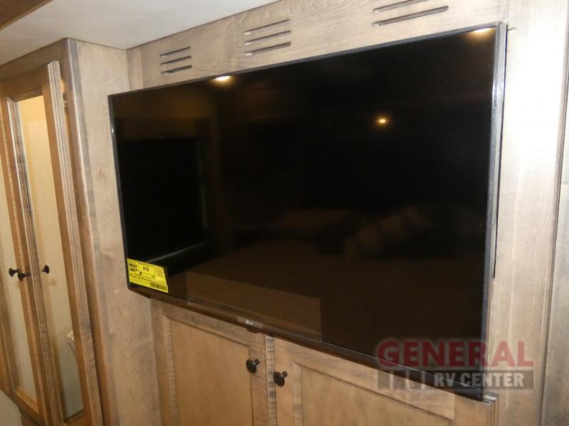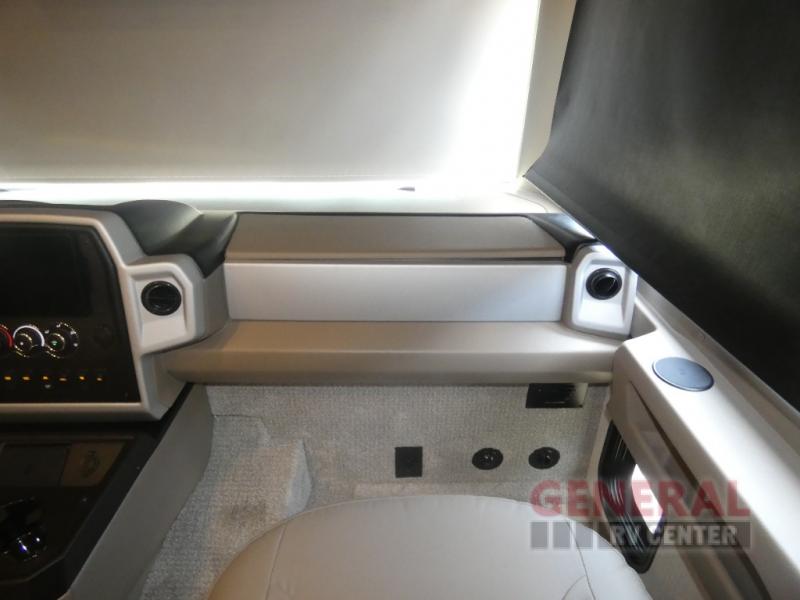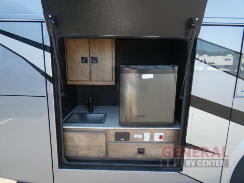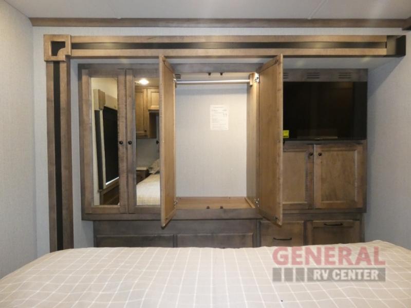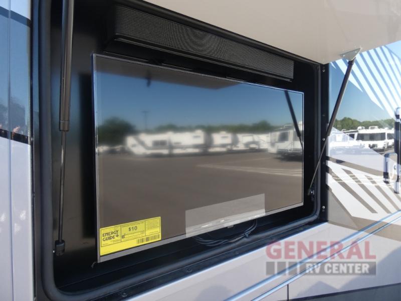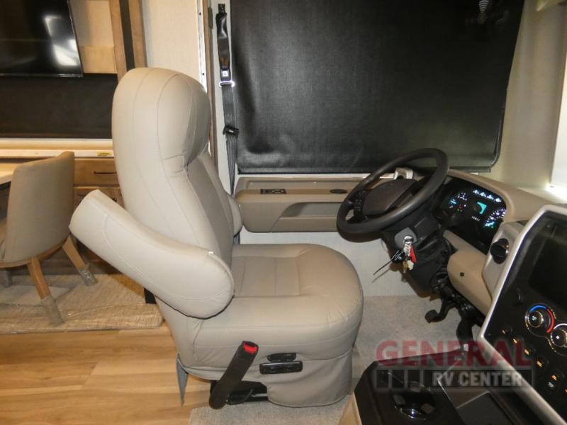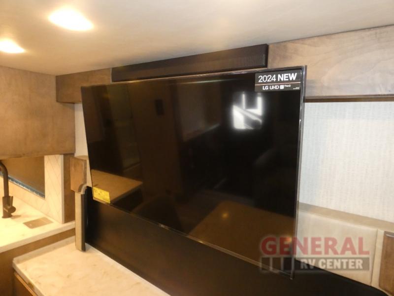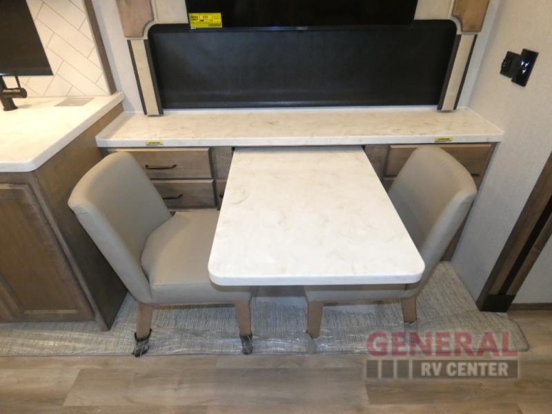 You'll love how easy it will be to maneuver this coach since it comes in at only 32-feet in length! The full-wall slide will open up your space so you can cook on the three burner range and dine at the booth dinette-sleeper. There is also a residential refrigerator and a pantry for food storage plus a bedroom wardrobe with drawers within the slide to keep your thing tidy. Once dinner is cleaned up, you can relax on the theater seating across from the wall mounted TV, or head outdoors to visit under the Girard power awning with LED lights. You're sure to get a great night's rest on the king bed, while your guests sleep on the booth dinette-sleeper. And if you're needing additional sleeping space, just choose the optional drop-down cab bunk!