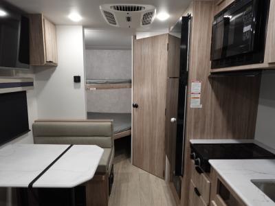This travel trailer is designed to make camping more comfortable, affordable, and fun for the whole family! The front 60" x 80" queen bed offers a comfortable place to lay your head at night and a shirt closet to hang your clothes. There are a set of 48" x 68" bunk beds for others to sleep, and you can even transform the 38" x 68" booth dinette into extra sleeping space. The fully equipped kitchen has everything you need to prepare a delicious home cooked meal and a 12V refrigerator to store any leftovers. After a fun-filled day, head to the rear corner bathroom to freshen up in the 30" x 36" shower with 14" x 22" skylight to let in some natural lighting!