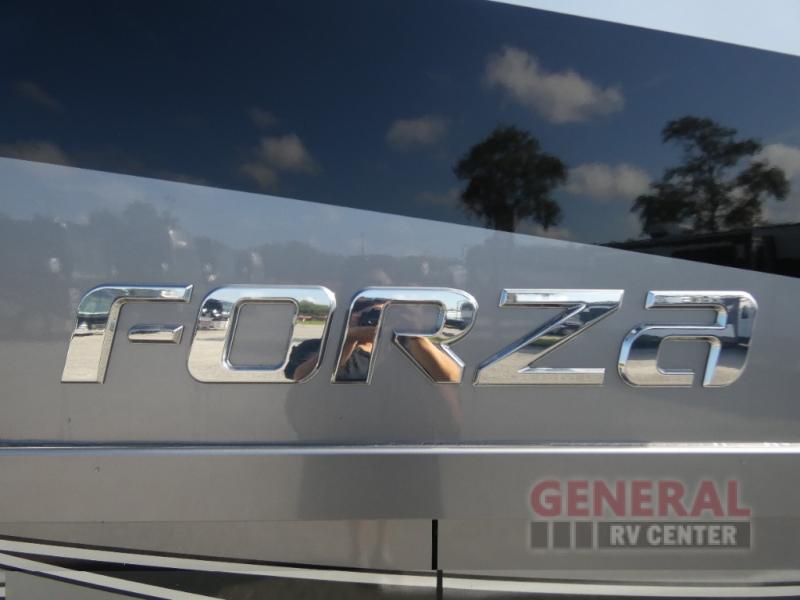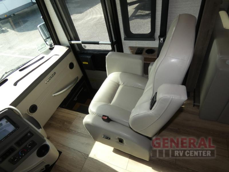 There isn't a thing you won't love about the Winnebago Forza Class A diesel motorhome! These powerful and practical coaches have excellent quality in their construction, and the undercarriage lighting is quite stylish and impressive. You'll find NeWay air suspension with V-Ride, automatic hydraulic leveling jacks, a 10,000-LB hitch, and automatic entrance steps. Sitting in the cab will be enjoyable with the multi-adjustable swivel and recline seats, the radio/rearview monitor system with 9" LCD color touchscreen, the cellphone interface to radio, and the TRW® tilt/telescopic steering column with foot-actuated pedal. The interior has a Firefly switch panel that lights up when it's dark, and the 6,000W gas generator is what you need to power your coach. You will also find vinyl flooring throughout, blackout roller shades, Corian countertops, a textured glass shower door, and many more comforts you'd expect to find at home!