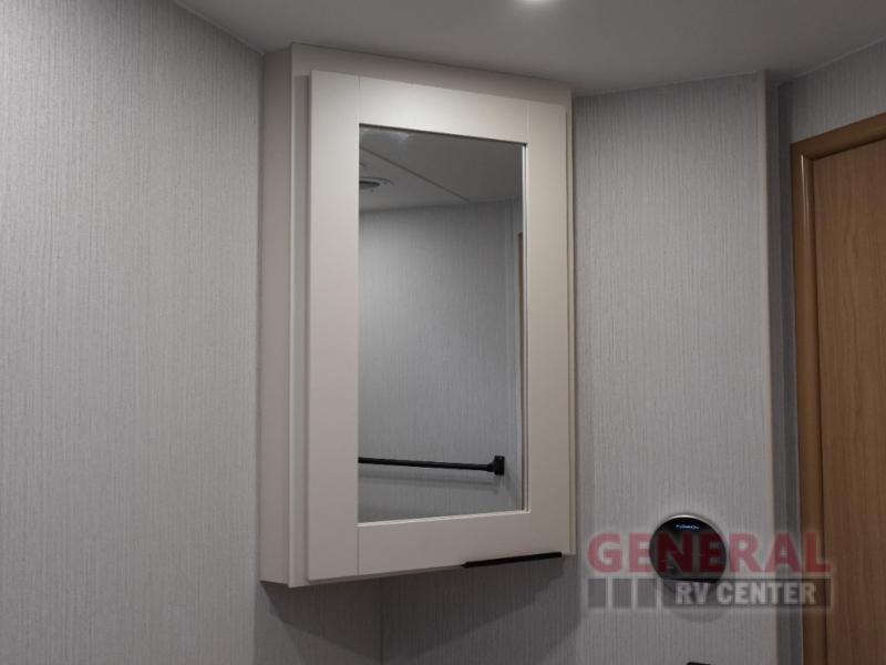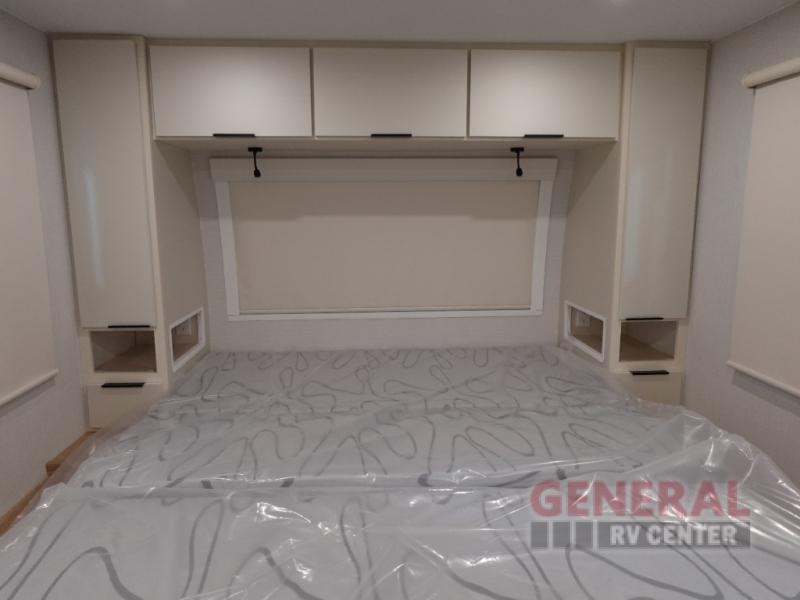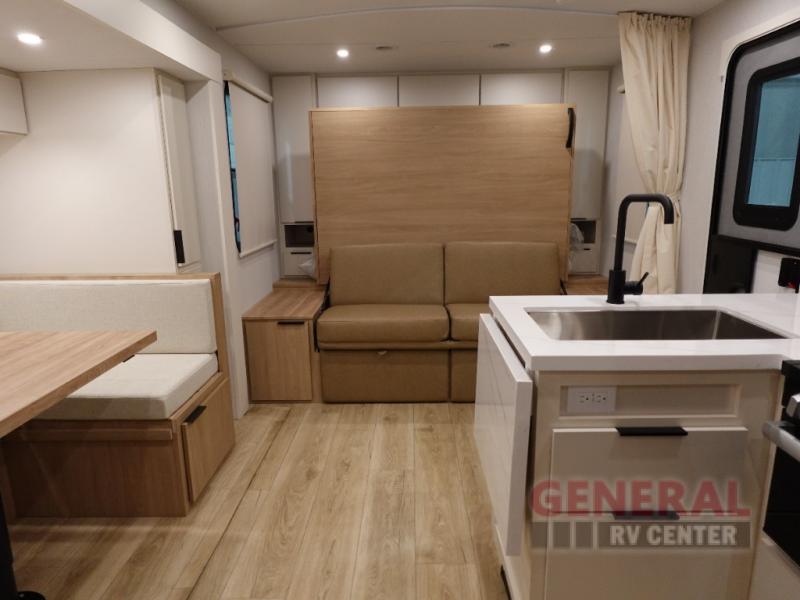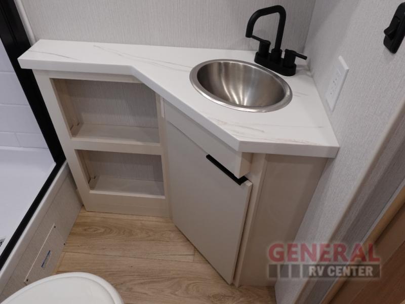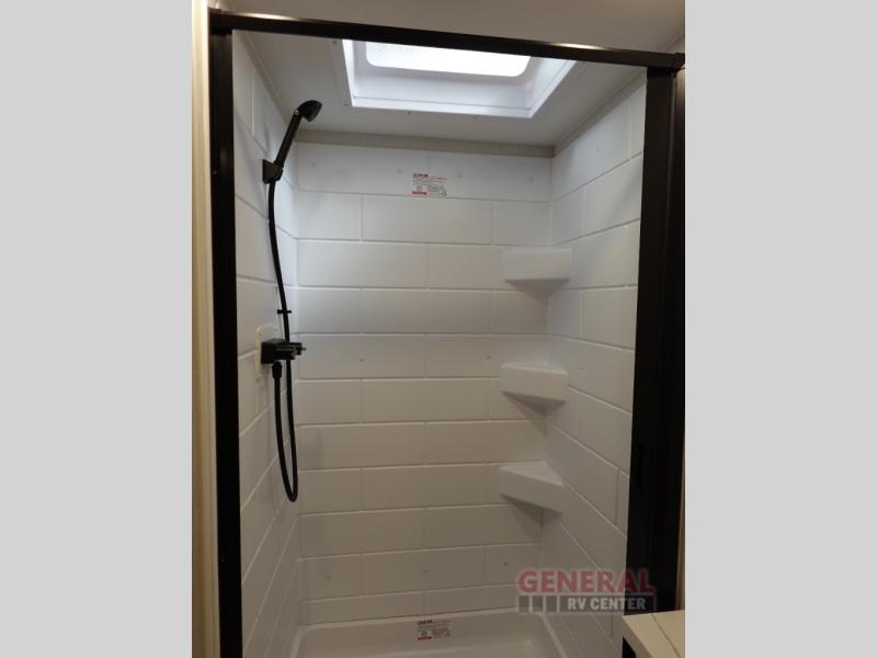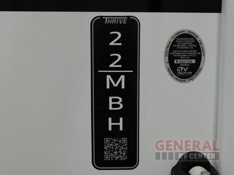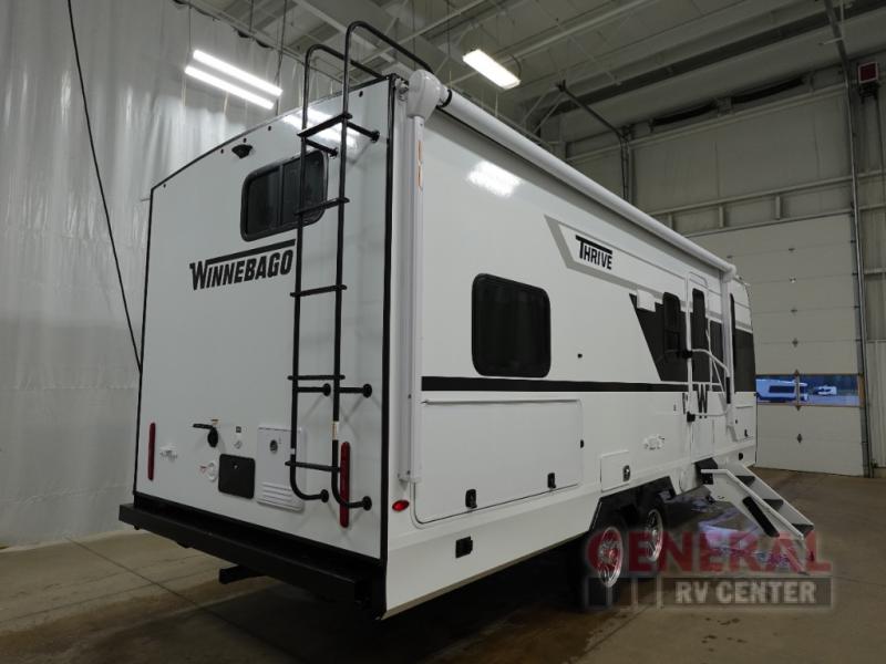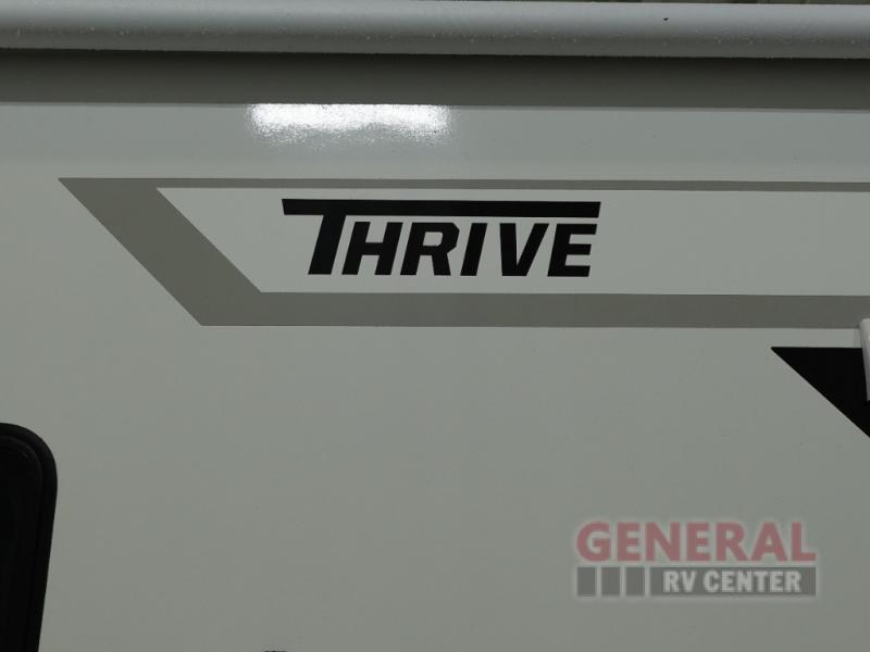 With any Thrive travel trailer by Winnebago, you can camp with functionality, comfort, and convenience! The large front viewing window with strike guard will be the first thing that catches your eye, and the fiberglass sidewalls with Azdel Onboard provide a durable trailer made to last. There is also an exterior ladder, along with front radius profile lights, power stabilizer jacks, and a powered awning with LED lighting to name a few exterior features. You will stay powered up by the 30-amp power cord and 200-watt solar panel, plus there is a tankless water heater for endless hot showers. Inside, you'll love the custom Winnebago furniture, carpetless side outs, molded fiberglass countertops, and residential recessed ceiling lights to keep your space well lit!