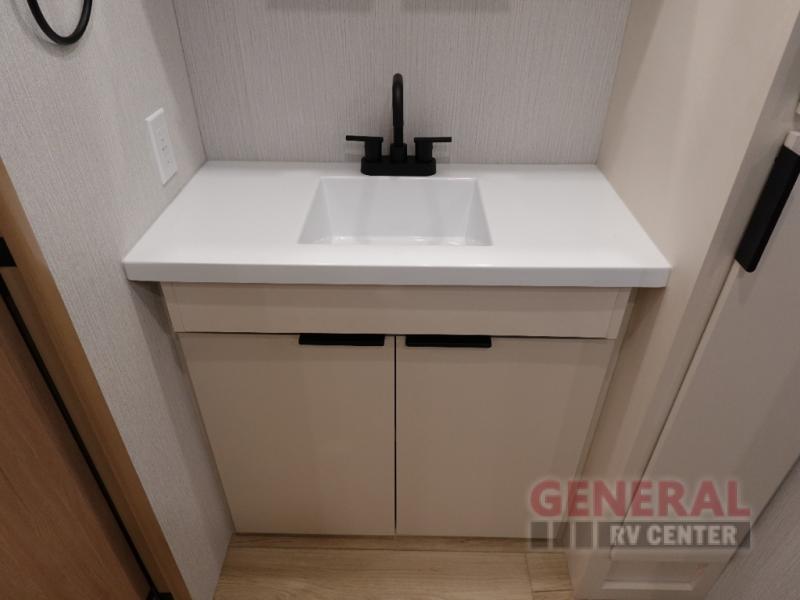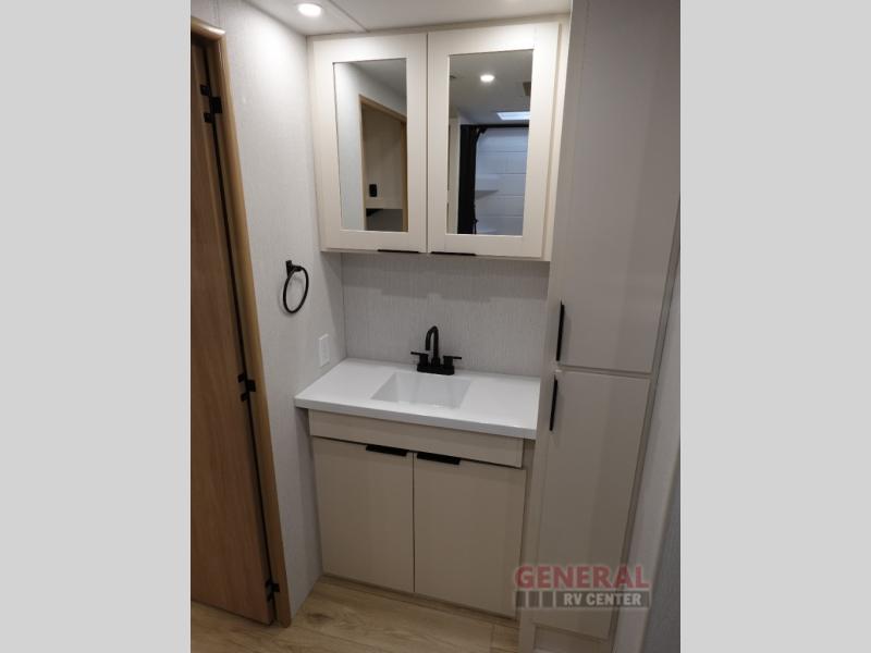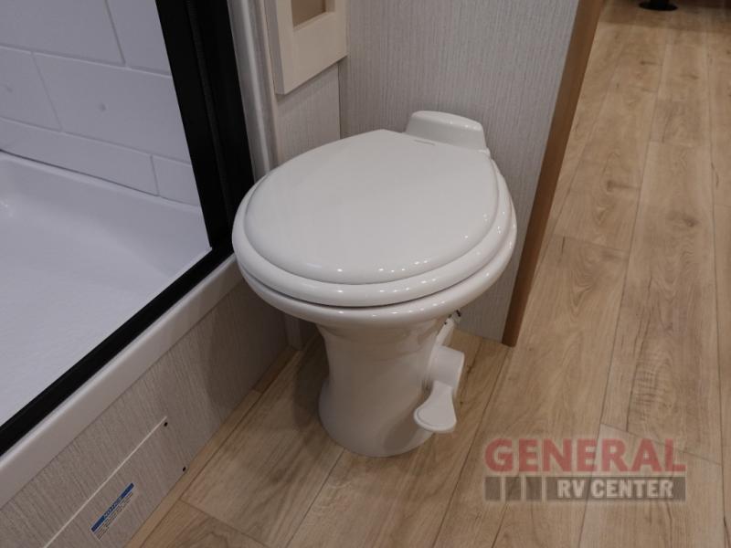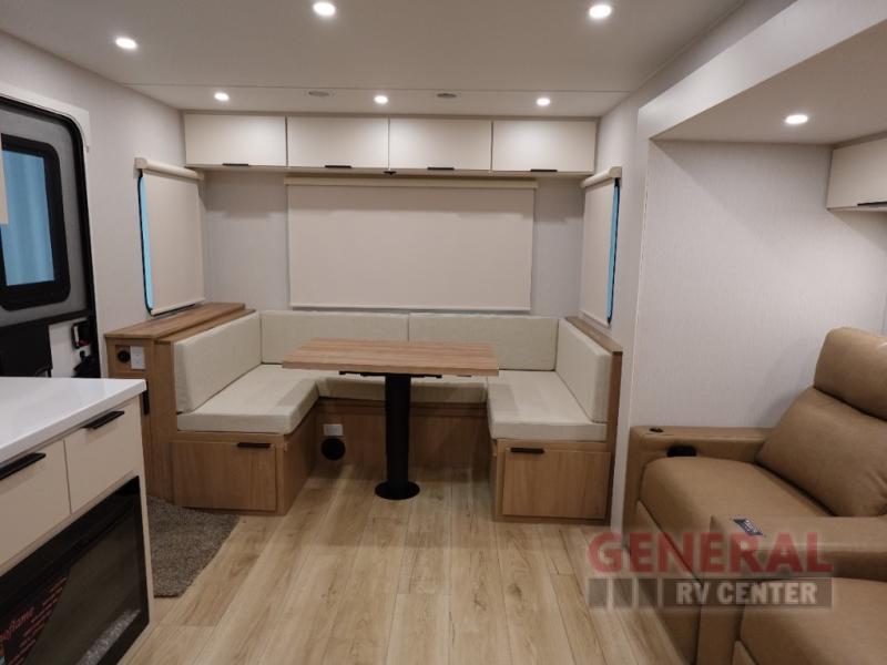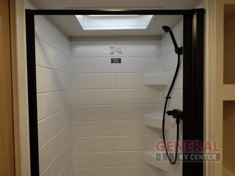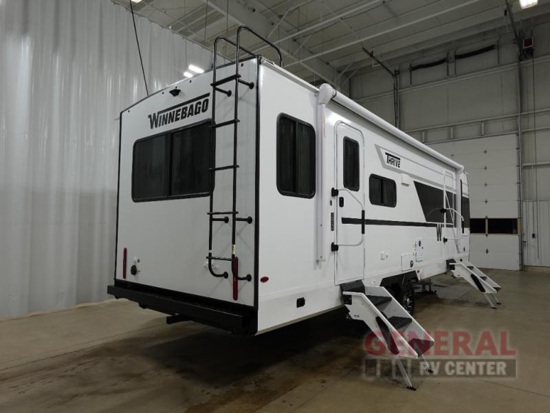 With any Thrive travel trailer by Winnebago, you can camp with functionality, comfort, and convenience! The large front viewing window with strike guard will be the first thing that catches your eye, and the fiberglass sidewalls with Azdel Onboard provide a durable trailer made to last. There is also an exterior ladder, along with front radius profile lights, power stabilizer jacks, and a powered awning with LED lighting to name a few exterior features. You will stay powered up by the 30-amp power cord and 200-watt solar panel, plus there is a tankless water heater for endless hot showers. Inside, you'll love the custom Winnebago furniture, carpetless side outs, molded fiberglass countertops, and residential recessed ceiling lights to keep your space well lit!