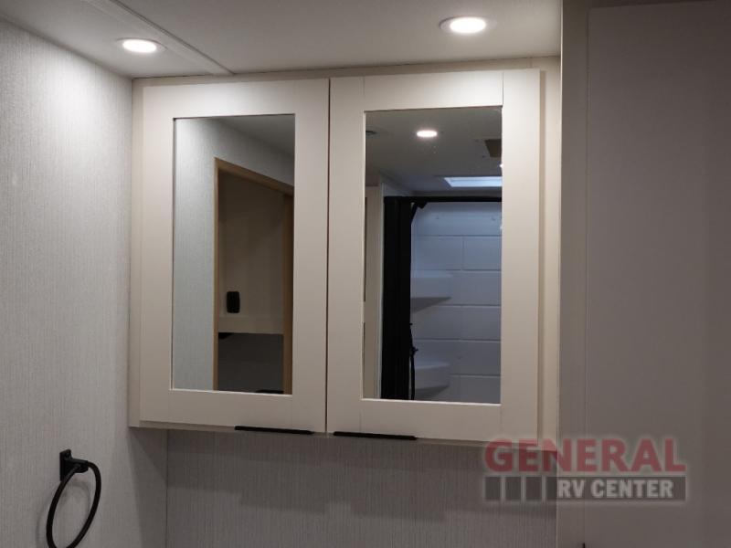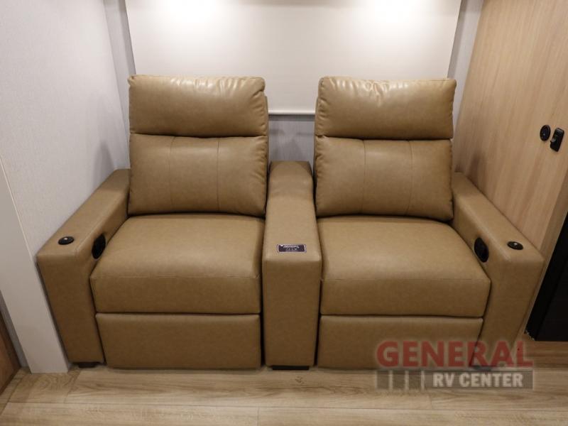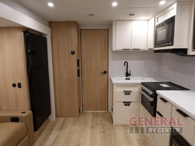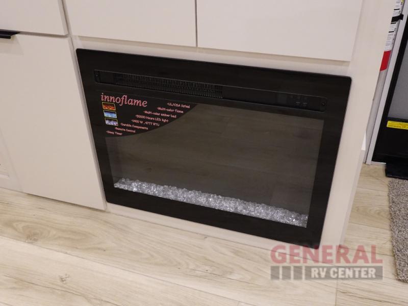 The rear living space of this travel trailer offers a spacious and welcoming layout, perfect for relaxing or entertaining after a day of adventure. In the main area there is a large 42" x 86" U-shaped dinette with plenty of room for meals, games or gathering to share stories. Beside there is theater seating located in the slide-out that adds extra comfort and seating space. Across, a cozy fireplace and TV making this the ideal spot for winding down in the evenings. The kitchen and appliances allow the chef to easily move around in the spacious living area. Moving forward, a pass-through bathroom adds convenience and privacy, leading to the front private bedroom. Here you'll find a spacious 66" x 80" Olympic Queen Bed, on each side wardrobes for ample storage. The bedroom also features a second exterior entry door, providing easy access without disturbing the main living area.